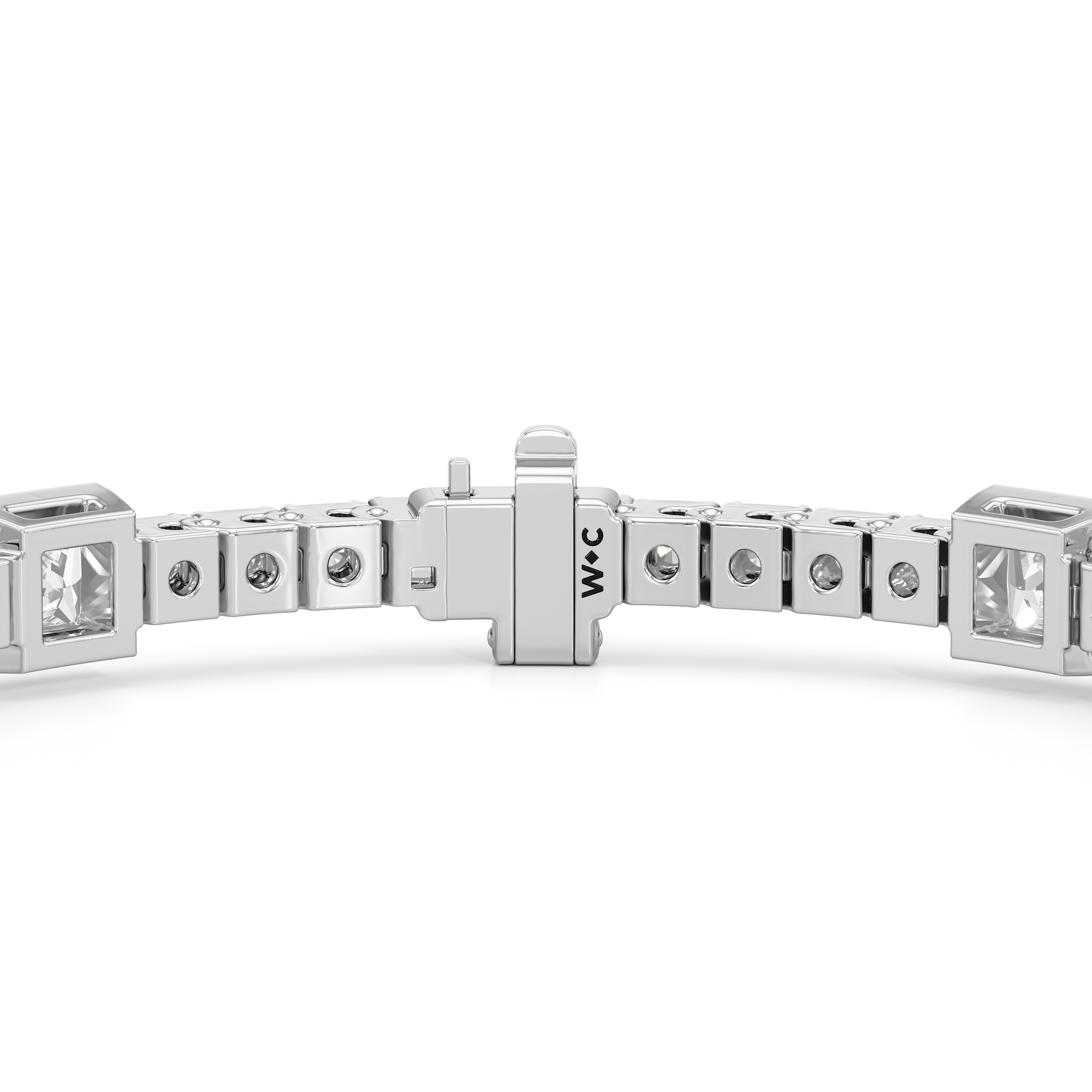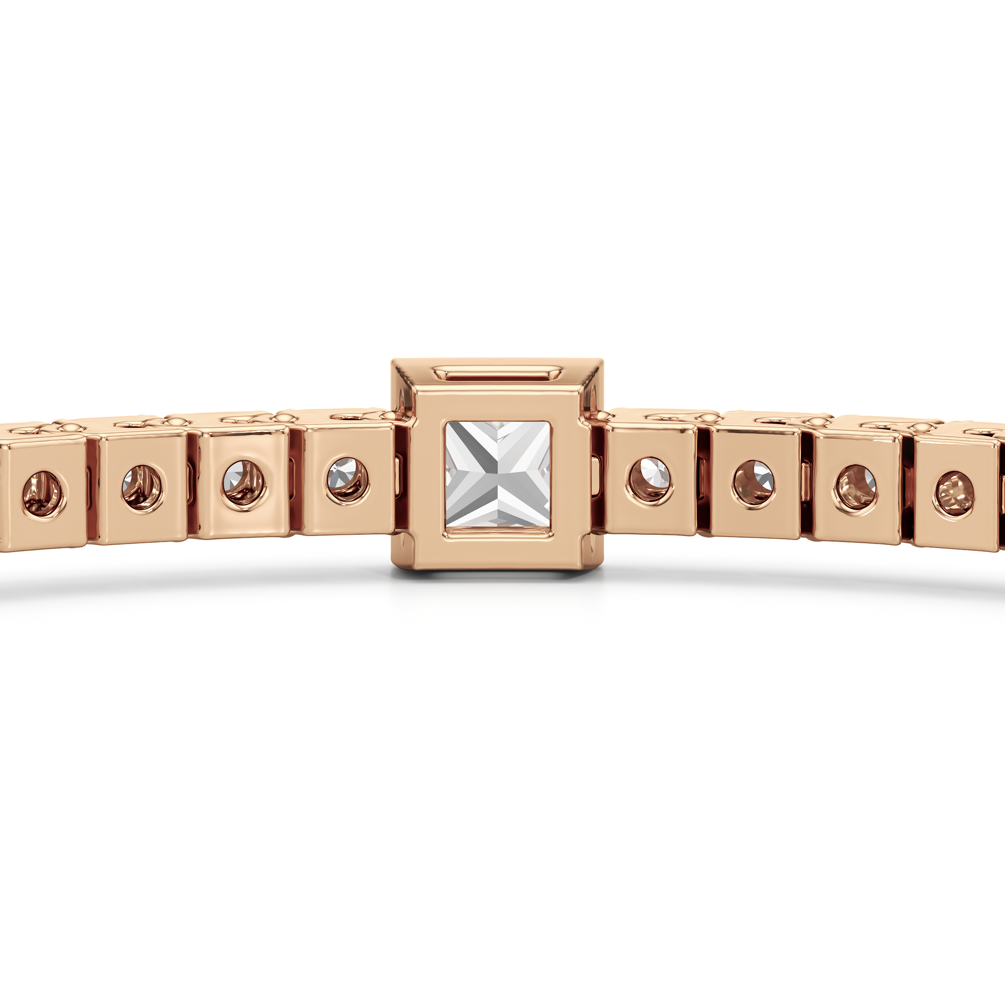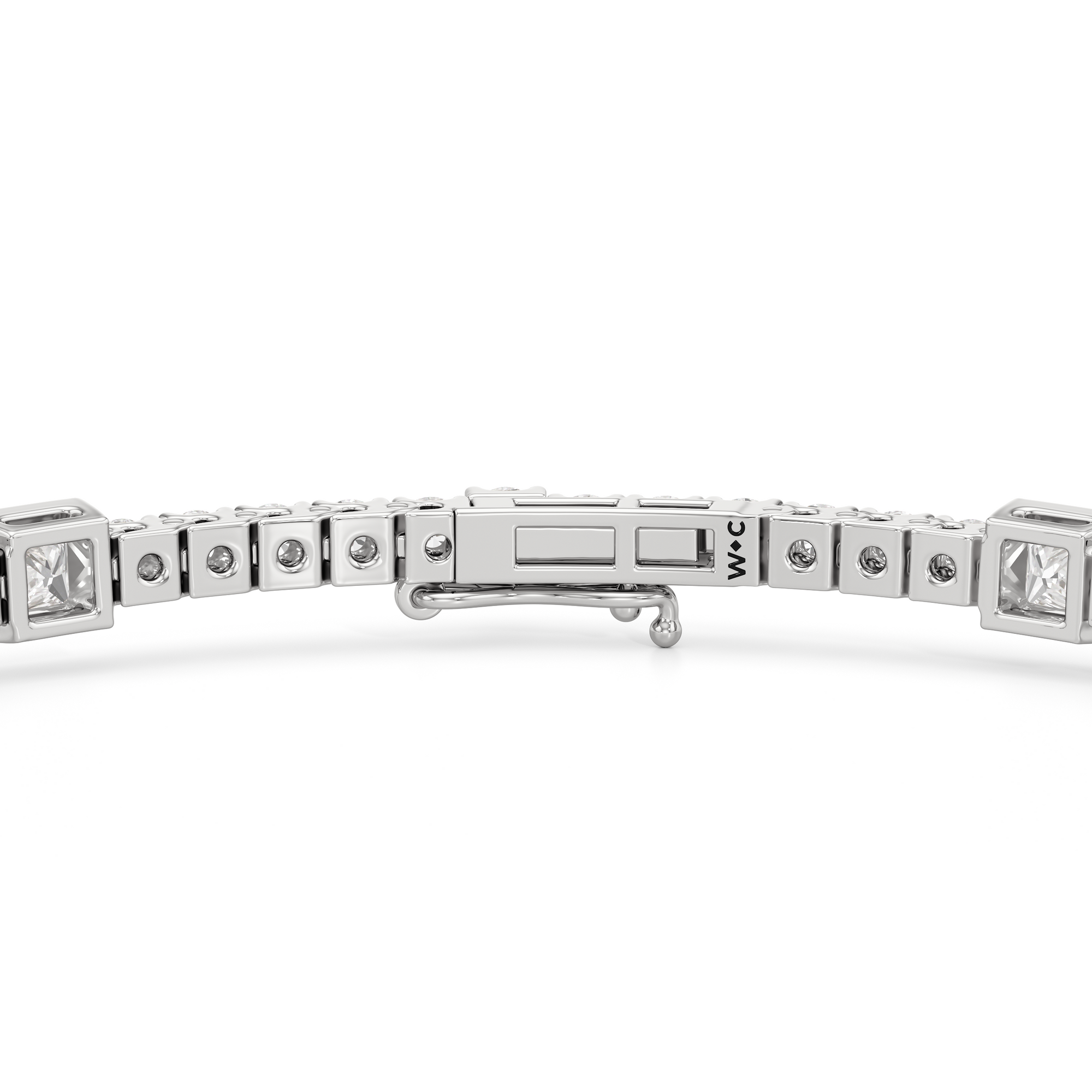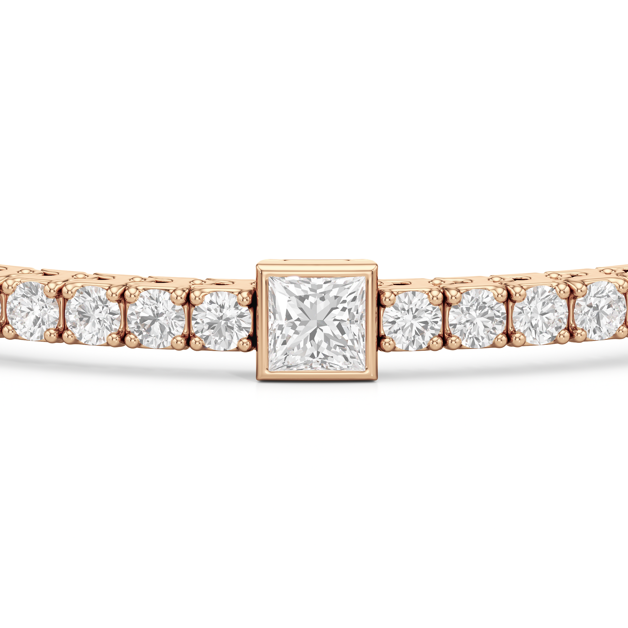 A unique choice. This tennis bracelet's singular strand of round diamonds is interrupted by princess-cut diamonds, each on a bezel setting. With its distinctive brilliance, this diamond bracelet ensures your jewelry stack is better than ever.