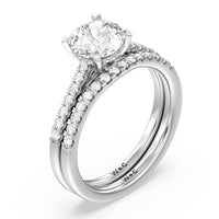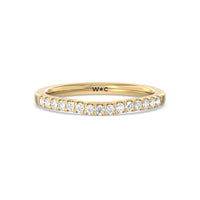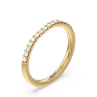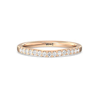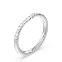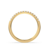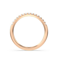 This curved diamond set wedding band is perfectly contoured to complement our cathedral diamond pave hidden halo engagement ring for a simple and sophisticated look.
