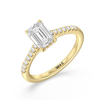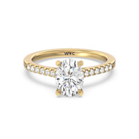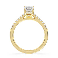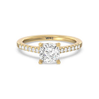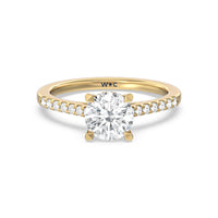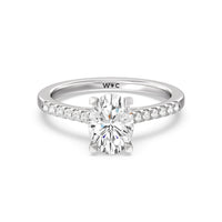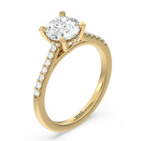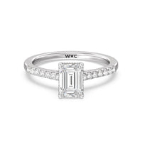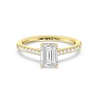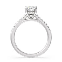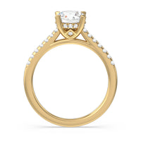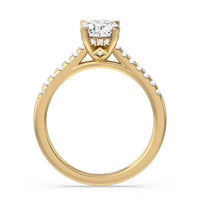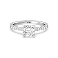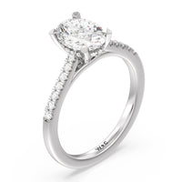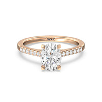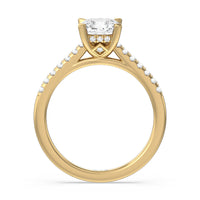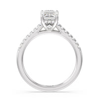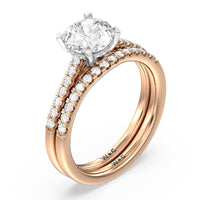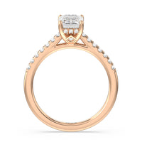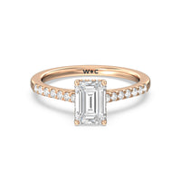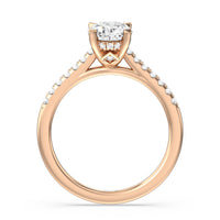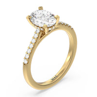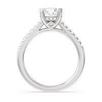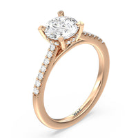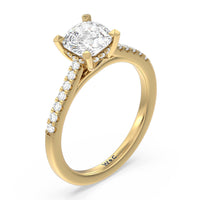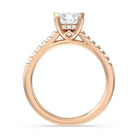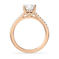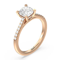 Elegant and feminine, this setting features pave-set diamonds in a delicate cathedral ring to frame the center diamond of your choice. Featuring a hidden halo and peek a boo diamond detailing.