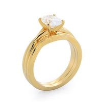 A subtle split shank looks gorgeous on your solitaire, but it requires a special design in a stacking wedding band. We took the same polished look from the diamond ring, mimicked it in this classic band, but curved it ever so slightly to sit flush as a perfect set.