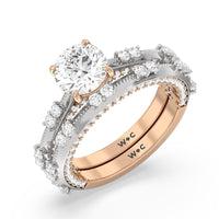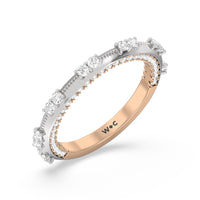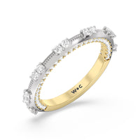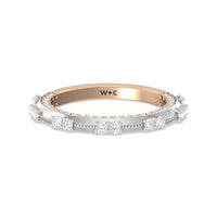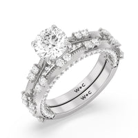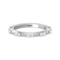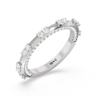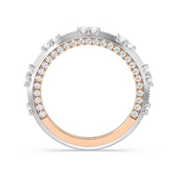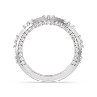 Shimmering pave diamonds cascade down this band to create a timeless beauty that will never go out of style. Designed to be paired with our twin stone station milgrain knife edge engagement ring for a simple and sophisticated look.