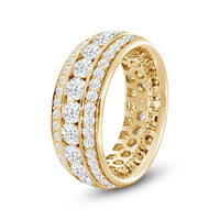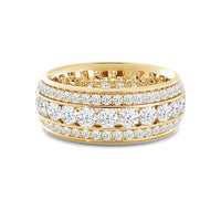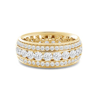 A tantalizing eternity ring with a design that is classic yet current. This ring dazzles with its three rows of brilliant diamonds. At the center is a channel of larger diamonds bordered by circular rows of smaller diamonds in a prong setting.