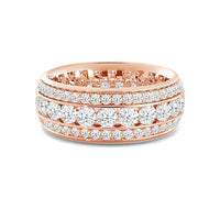 A tantalizing eternity ring with a design that is classic yet current. This ring dazzles with its three rows of brilliant diamonds. At the center is a channel of larger diamonds bordered by circular rows of smaller diamonds in a prong setting.