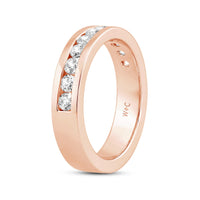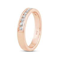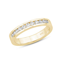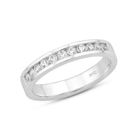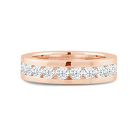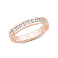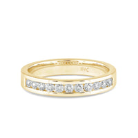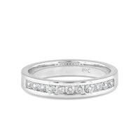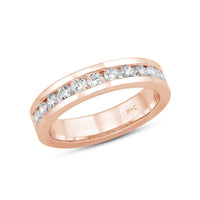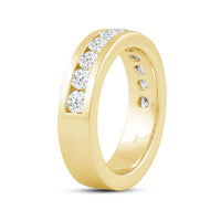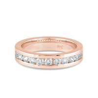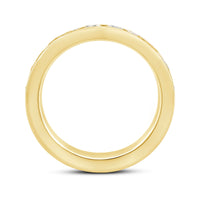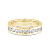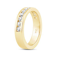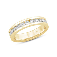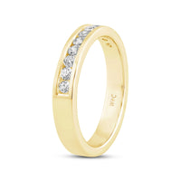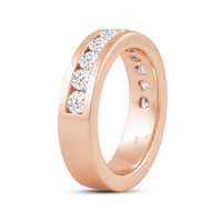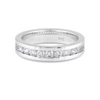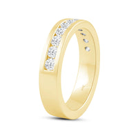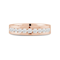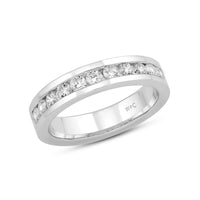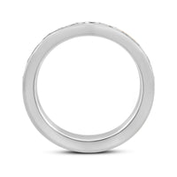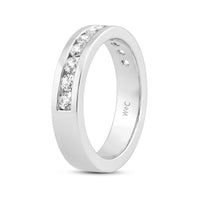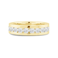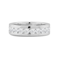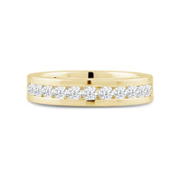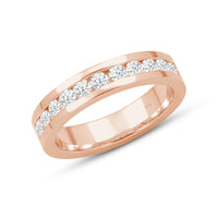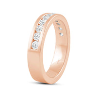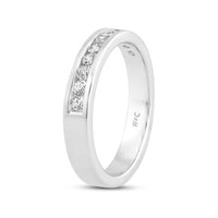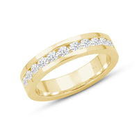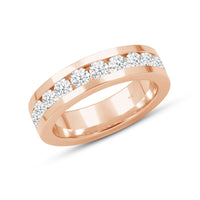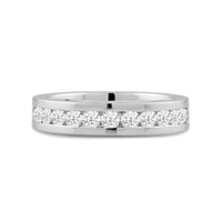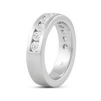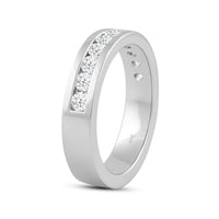 A gentleman's ring designed with relaxed elegance. This piece features a narrow band with a high-luster finish and a row of channel-set diamonds. The shimmering stones bring a subtle splash of brilliance to this discreet symbol of commitment.