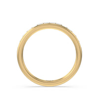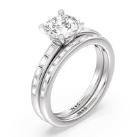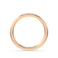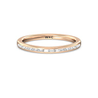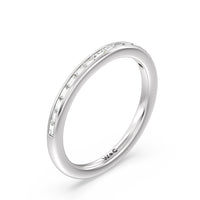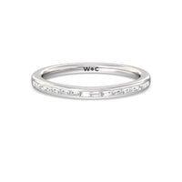 This curved diamond set wedding band is perfectly contoured to complement our channel set kite basket solitaire engagement ring for a simple and sophisticated look.