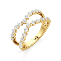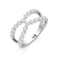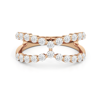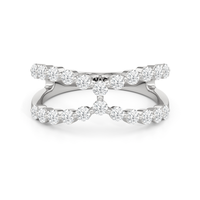 Two inverted chevrons studded with diamonds meet at the center to form an angular yet graceful silhouette with a subtle open space in the middle. This negative space gives the ring a subtle, architectural appeal and creates a broader and more distinct presence on the finger.