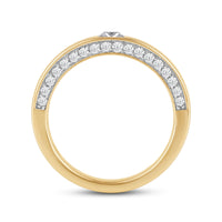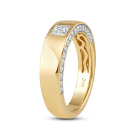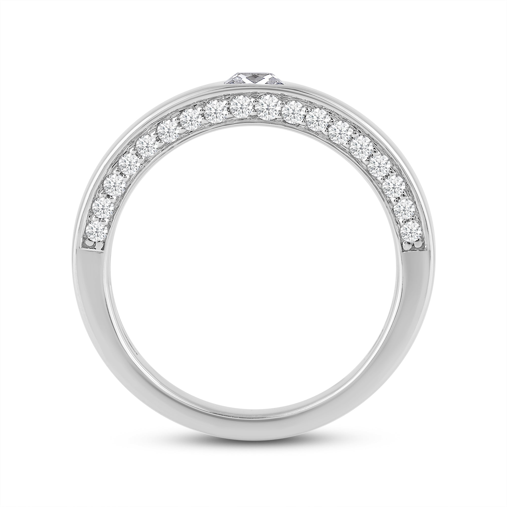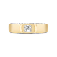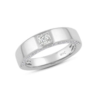 Immortalize love through this ring that can look both showy and discreet. This men's engagement ring offers a fanciful yet clean profile. The highly polished shank is topped with a classic bezel-set diamond. For a statement-making style, the band's sides are pave-set with round diamonds.