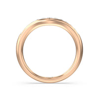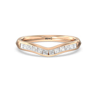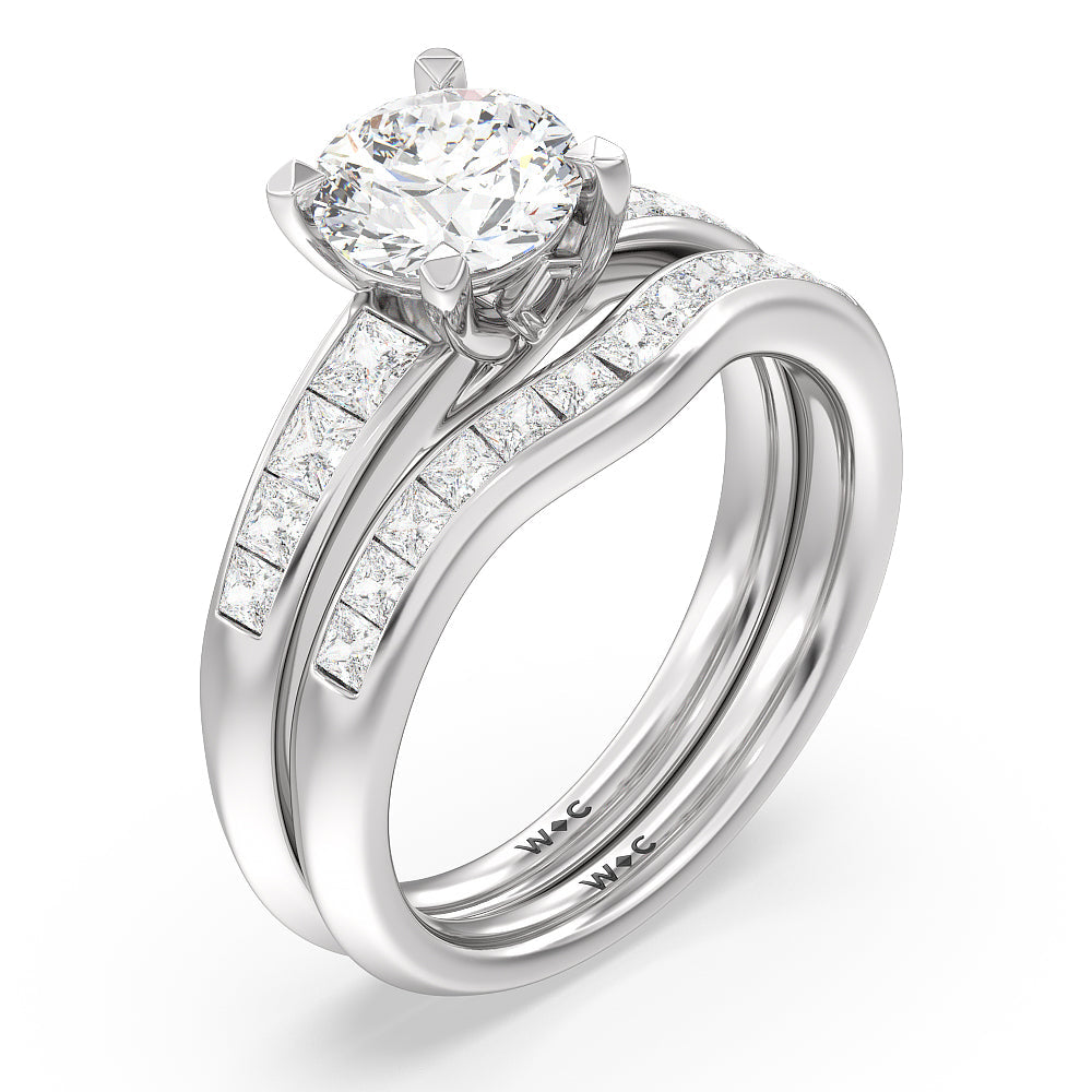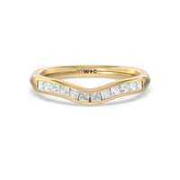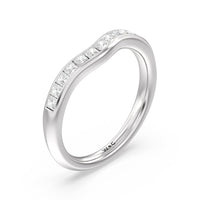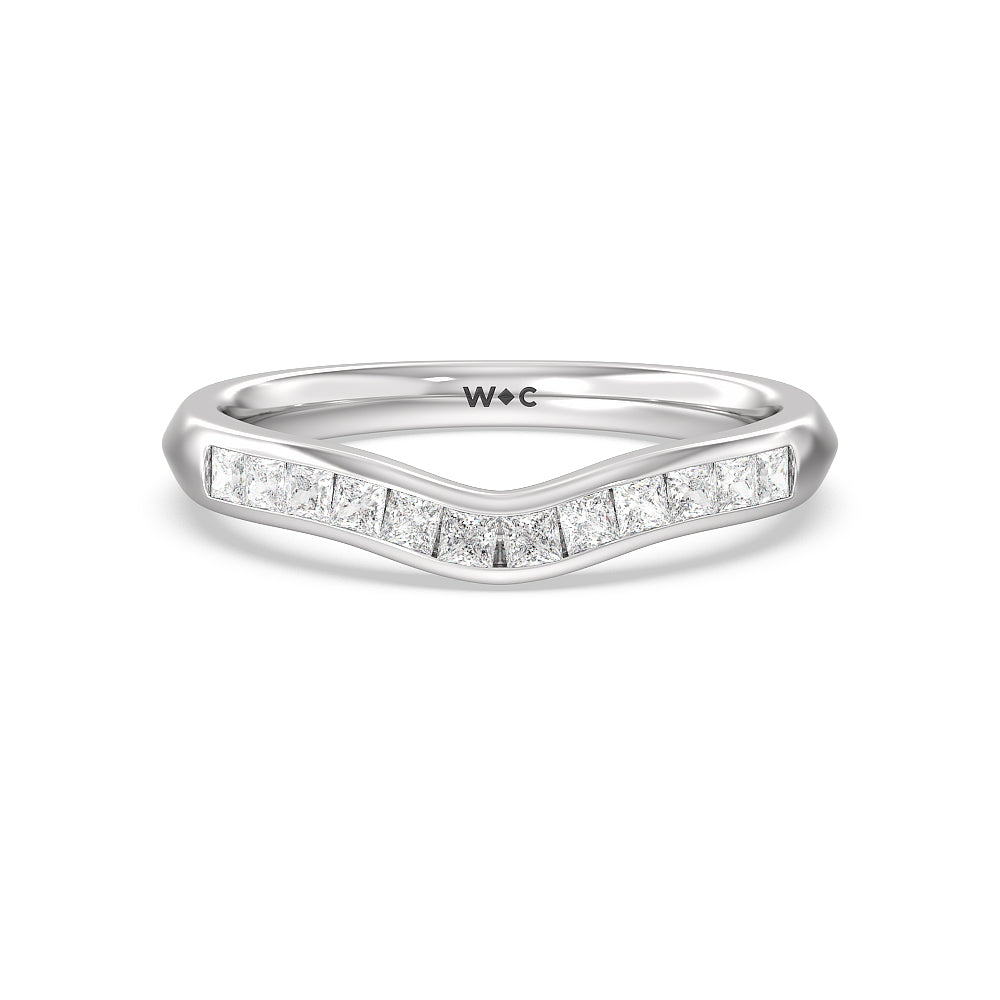 This curved diamond set wedding band is perfectly contoured to complement our classic channel set princess kite basket diamond engagement ring for a simple and sophisticated look.