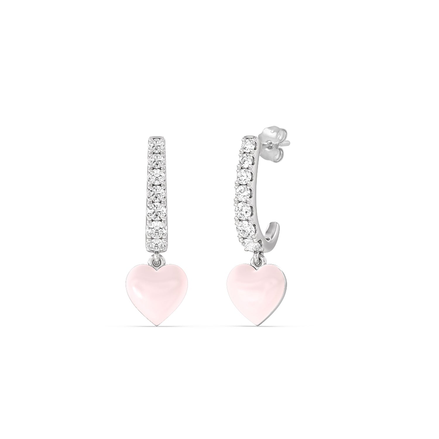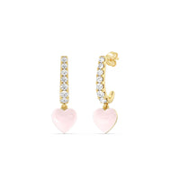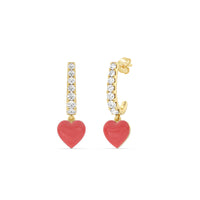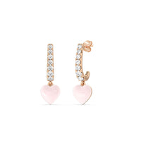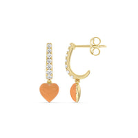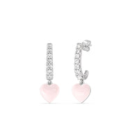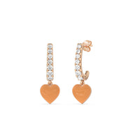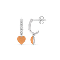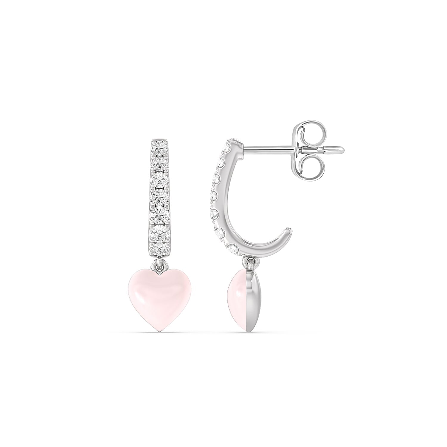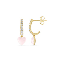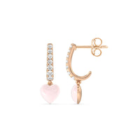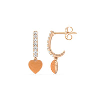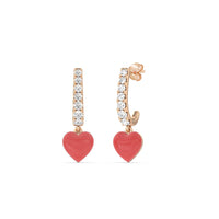 These heart huggies are a must have in every jewelry wardrobe. Each silk earring has a c-shaped post embellished with round diamonds of graduating sizes. At the bottom of the half-hoop is a heart-shaped drop accent, creating the perfect finishing touch.