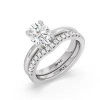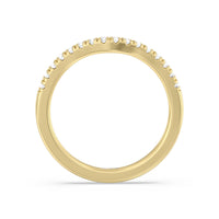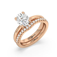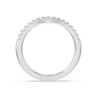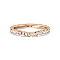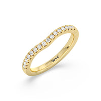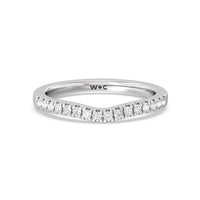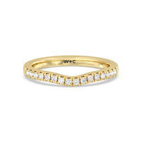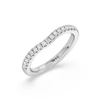 This curved diamond set wedding band is perfectly contoured to complement our classic four prong solitaire diamond engagement ring for a simple and sophisticated look.