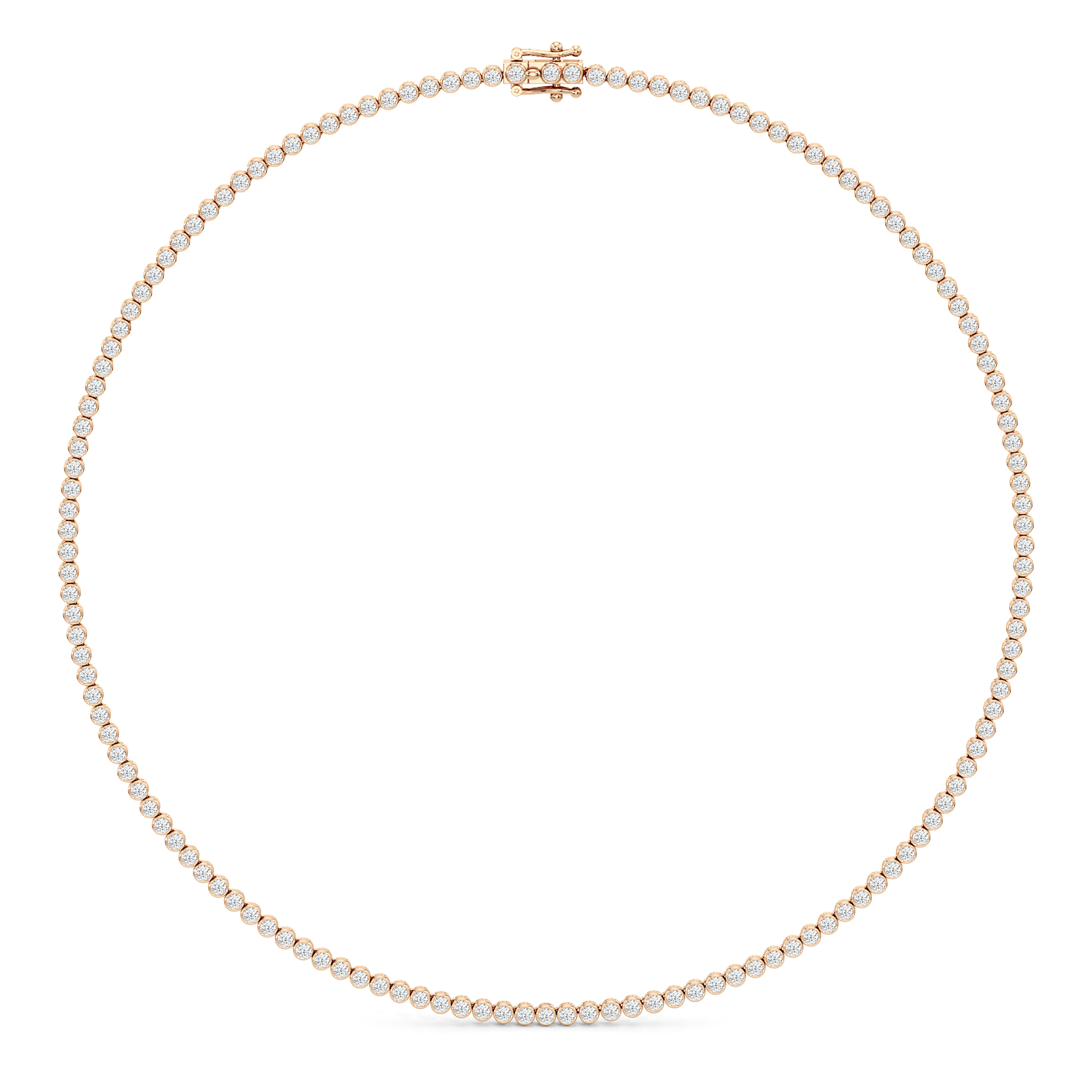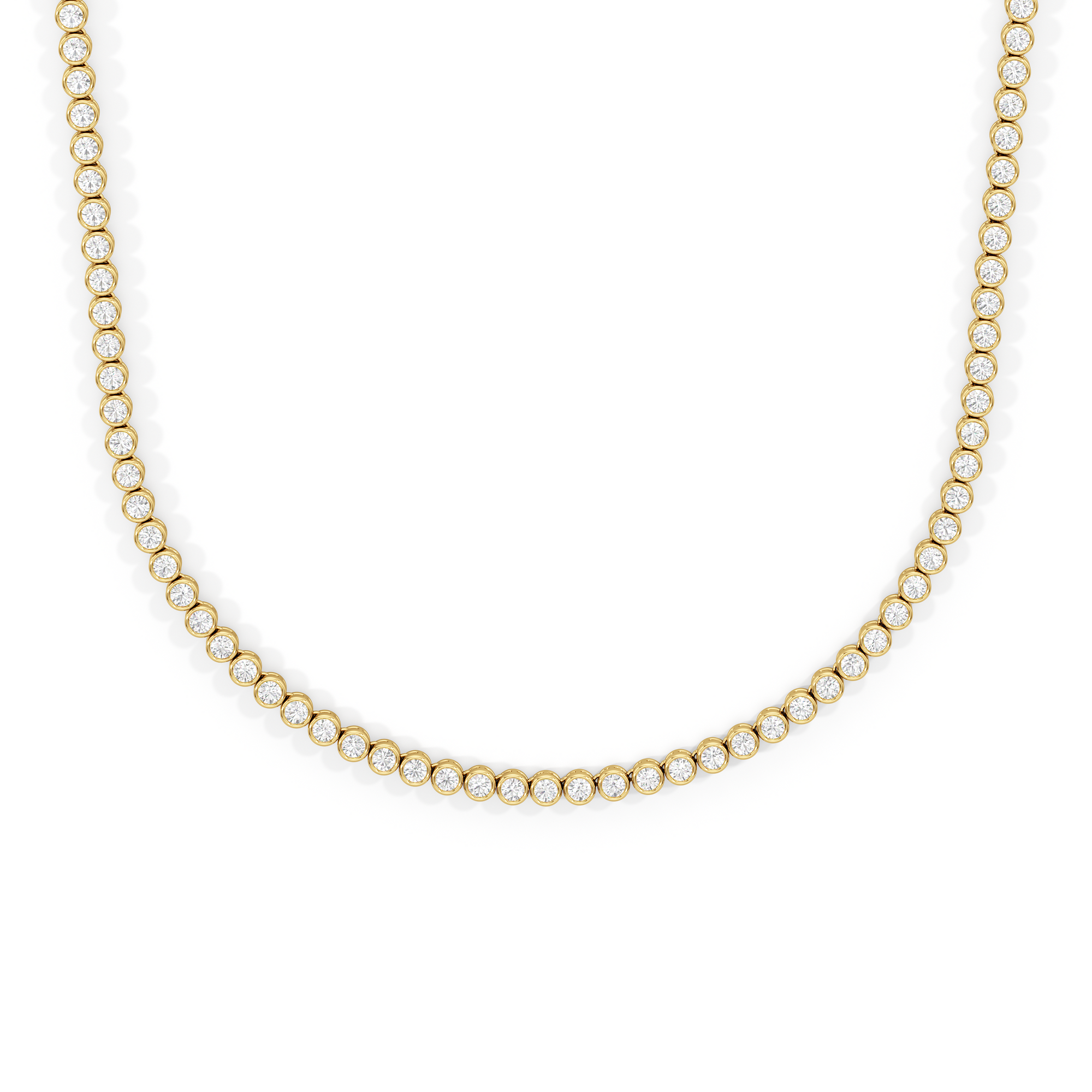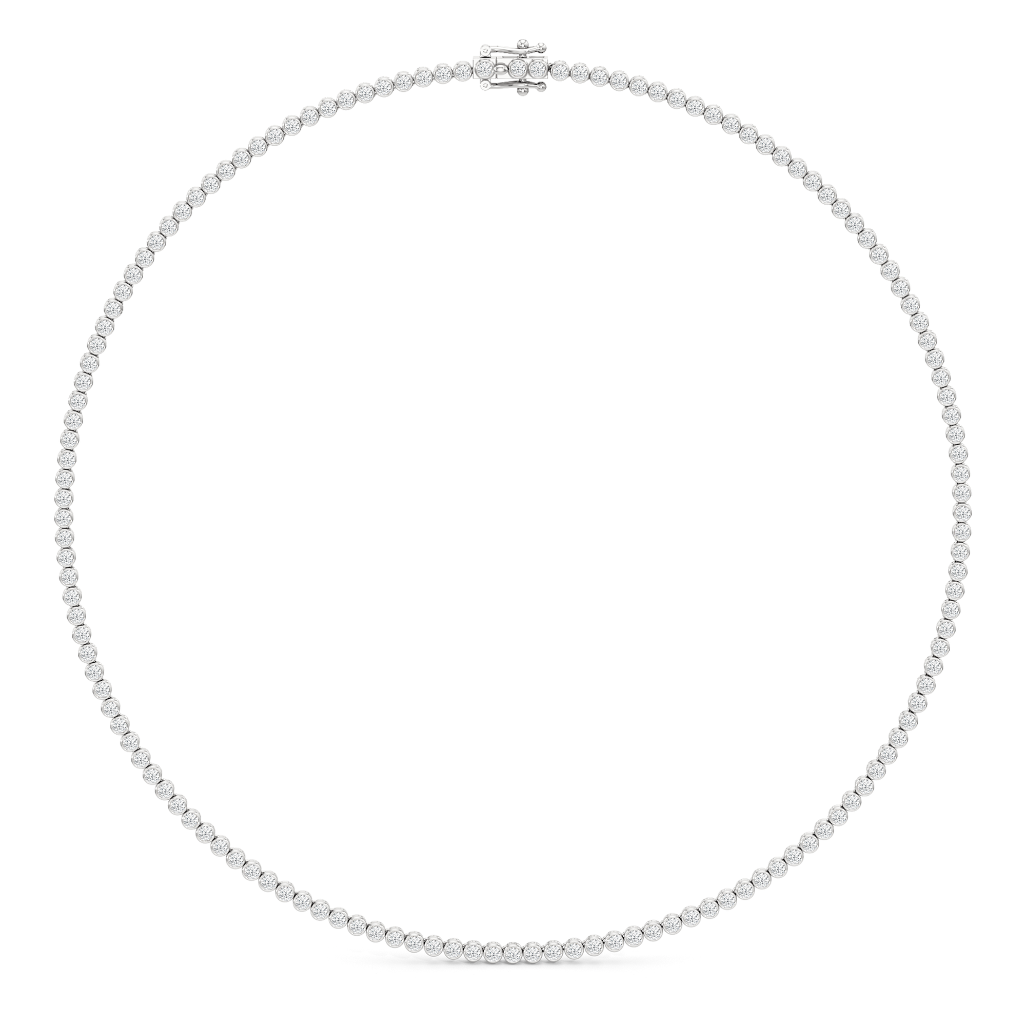 The Classic Round Bezel Diamond Tennis Necklace mixes being classic with on-trend elegance. The round bezel diamonds create a minimalistic look that give it an added flair. This design captures the enduring appeal of classic jewelry while staying perfectly in step with today's understated luxury trends.