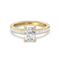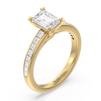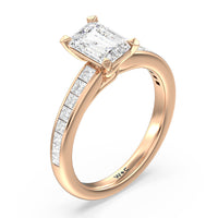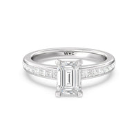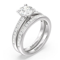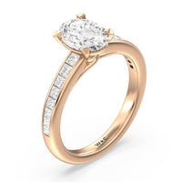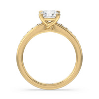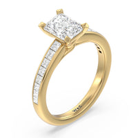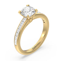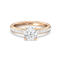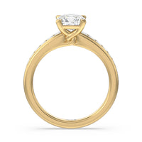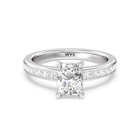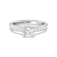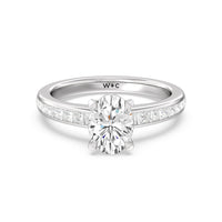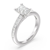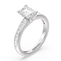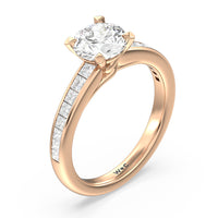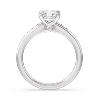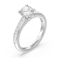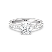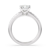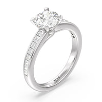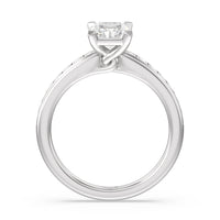 This sparkler looks modern without straying too far from tradition. The centerstone is held securely by a four-prong basket with a decorative knot detail for that subtle touch of whimsy. Flanking the center diamond are rows of smaller diamonds on channel setting.