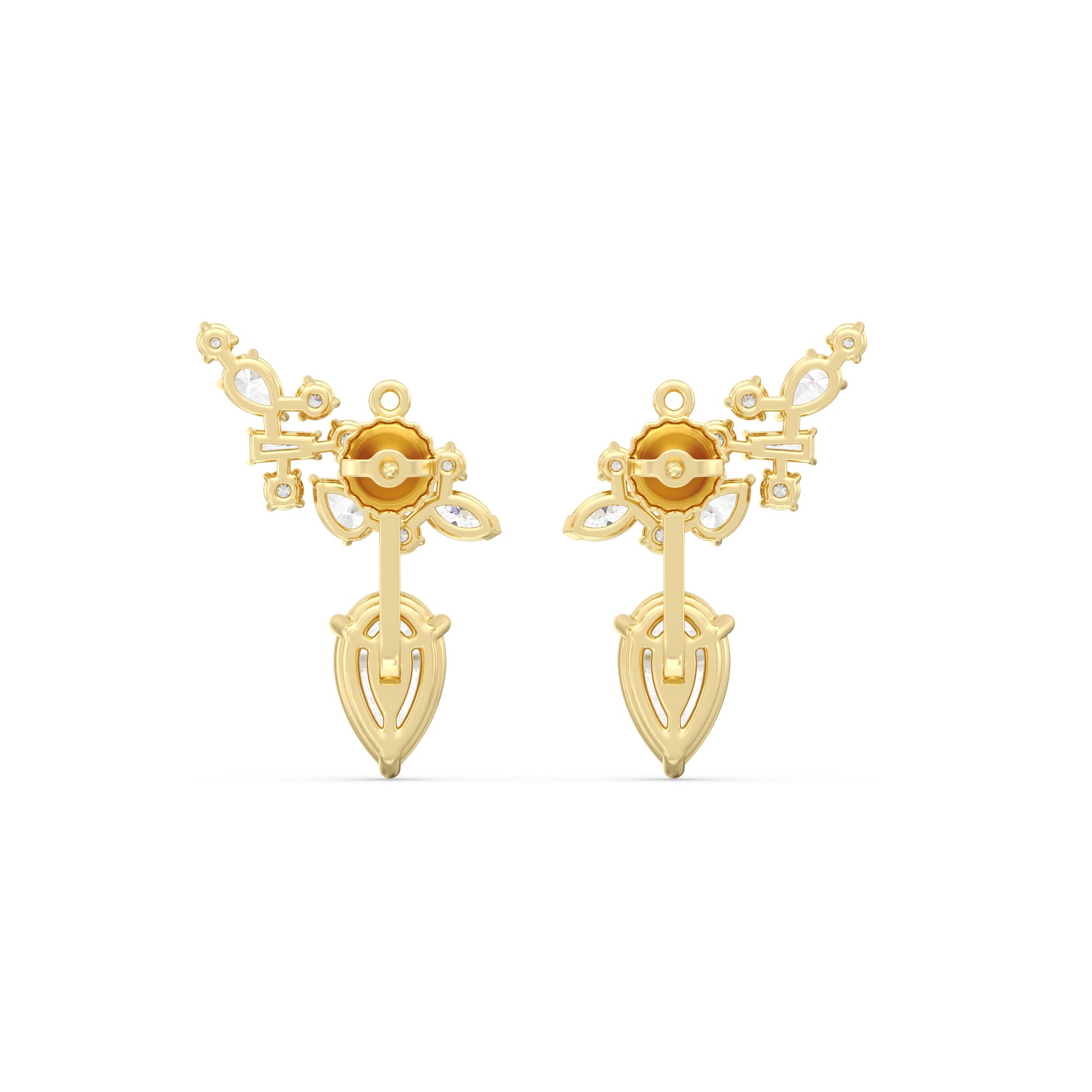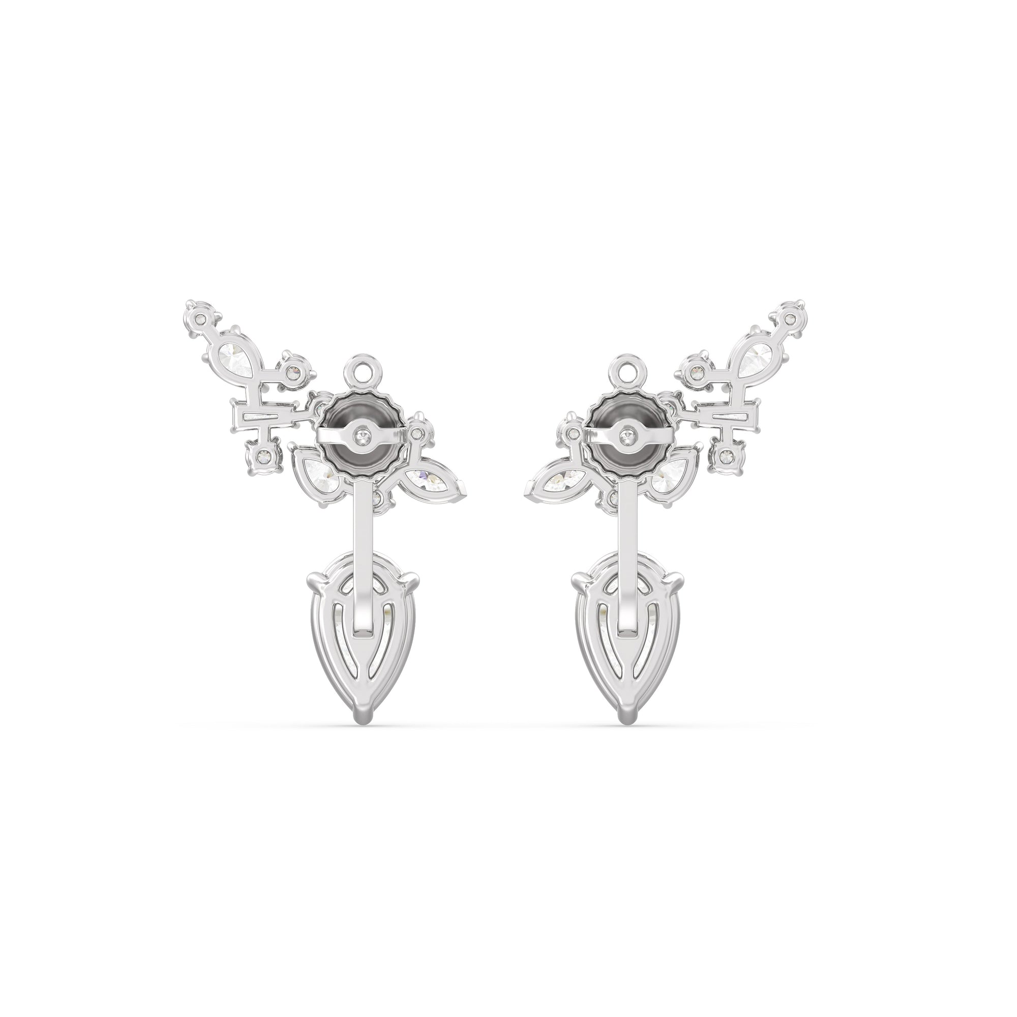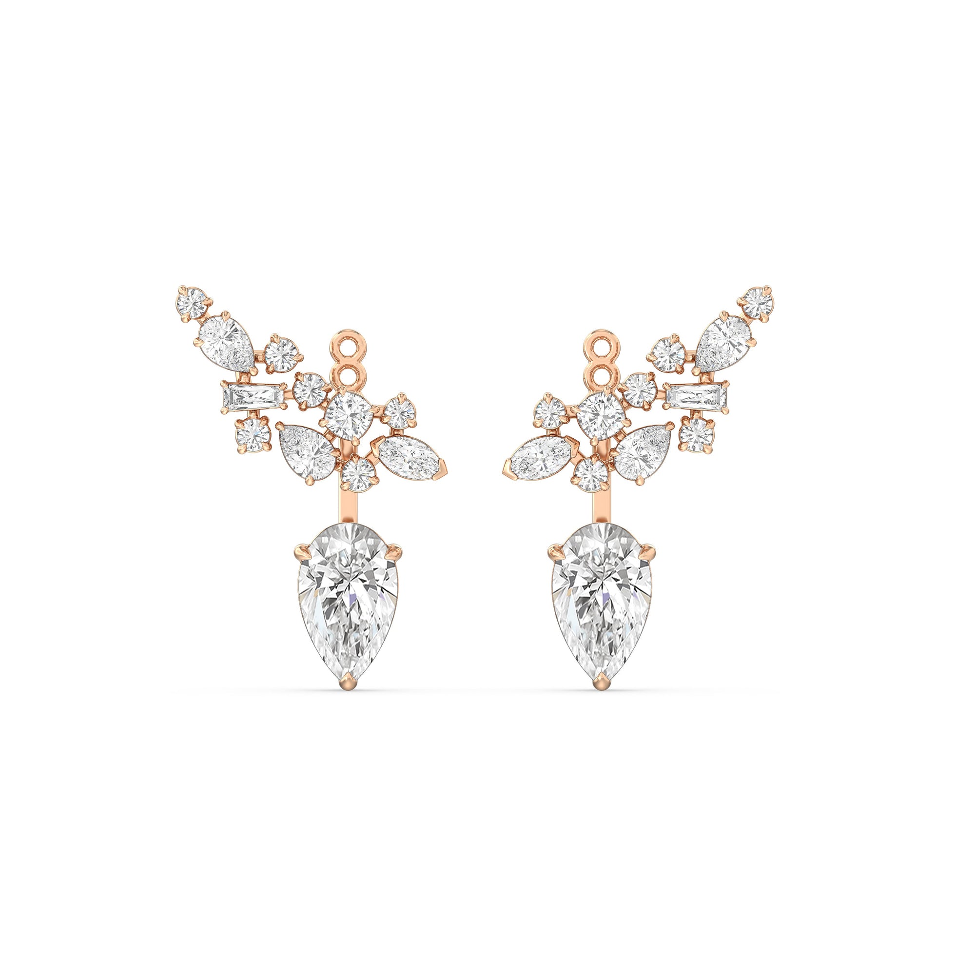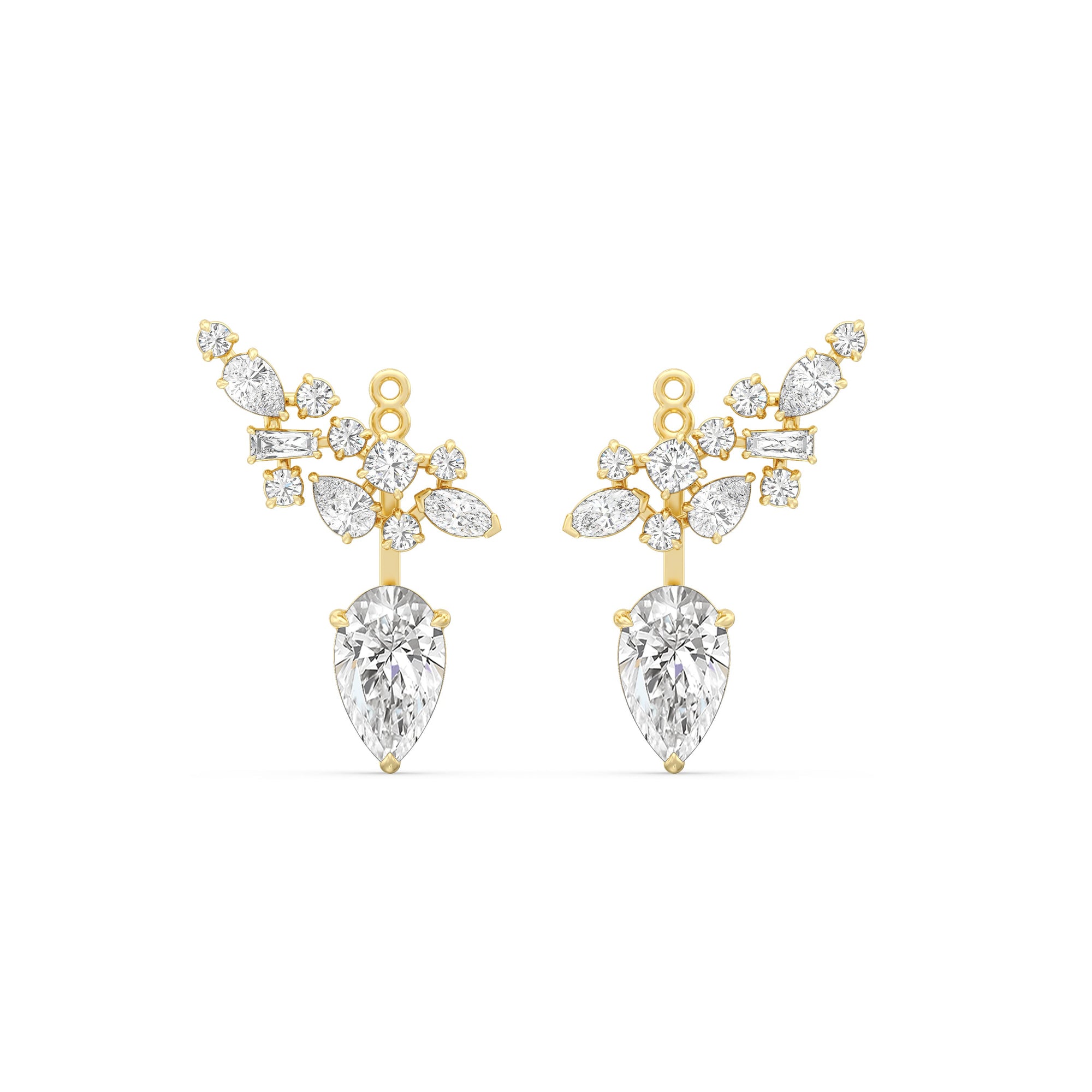 These diamond earrings instantly make an unforgettable statement. These multi-shape earrings are delicatetly encompass 12 diamonds within each cluster along the ear. A larger pear diamond completes each earring and comes from the back.
