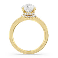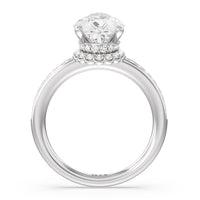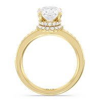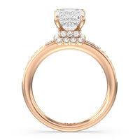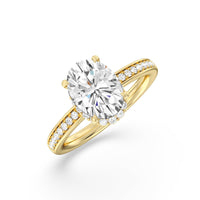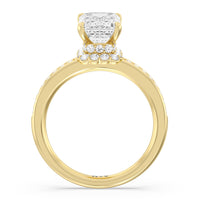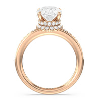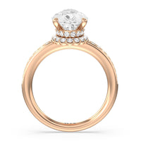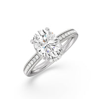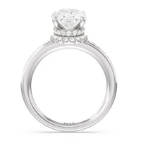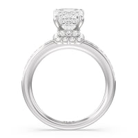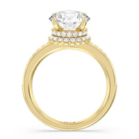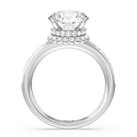 Here is an incredibly radiant engagement ring for the bride-to-be whose personality never fails to shine bright. This flawless stunner features an imposing center stone with two tiers of hidden halos wrapped around its base. The slim shank also has its shoulders traced by petite round diamonds.