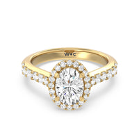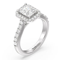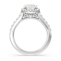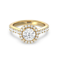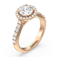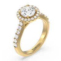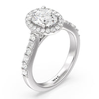 This dazzling ring speaks for itself. It offers a delicate blend of modern and classic with its evenly paved slim shank and the single ring of shimmering diamonds surrounding a center stone. The thin band allows another ring, like a wedding band, to be neatly layered or nested together with this exquisite piece.