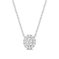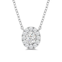 Here is what you need to wear when your outfits need a touch of dressing up. This white gold necklace sparkles bright with oval diamond surrounded by a halo of round diamonds. Add this luxurious accessory to update the style of any look.