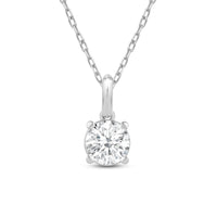 The perfect sparkler to spice up your accessorizing game. This solitaire pendant features a round diamond secured by a compass four-prong setting. The knife-edge bale brings that unexpected touch of edginess to this elegant piece.