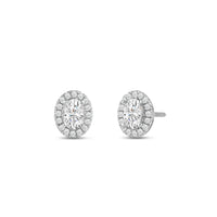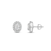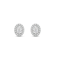 Classic oval cut earrings with a stunning halo of round stones encircling the center stone.A lovely outfit-maker, this pair of stud earrings is what you need to give any ensemble a polished, put-together finish