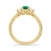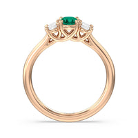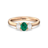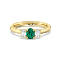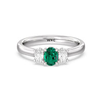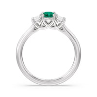A striking style featuring a centerpiece created Emerald highlighted by two smaller matching diamonds either side.
