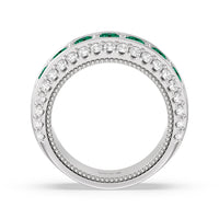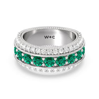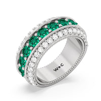 With triple rows of stones running halfway down the shank, expect this gorgeous two-toned ring to deliver an abundance of sparkle. This piece is designed with a wide band with round diamonds and created Emerald on shared prongs tracing its center. The edges are outlined with pave-set petite diamonds. The inner shank's surface is in yellow gold with milgrain outline for a bit of added drama.