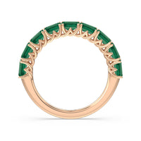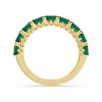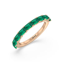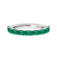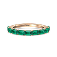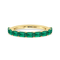 This ring looks modest and refined yet has a charming, unexpected twist. The slim band has its upper half traced with nine emerald-cut Created Emeralds Each stone is secured by a four-prong U-shaped basket that intertwines with a wavy bridge.