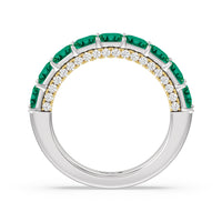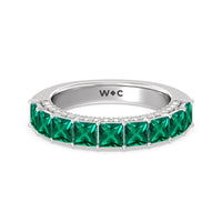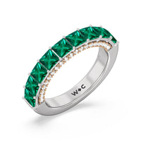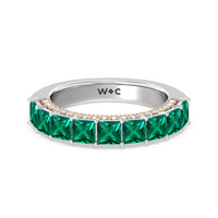A standout sparkler. This half-eternity ring that's perfect as an anniversary ring epitomizes glowing beauty. Half of the band is traced with created Emerald princess-cut on a prong setting. Underneath the princess created Emerald is an arch of petite round diamonds set on prongs in a different metal tone. The two-toned look and the continuous sparkle give this piece a fashion-forward style plus lots of personality.