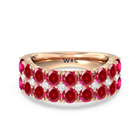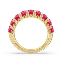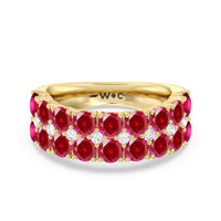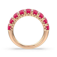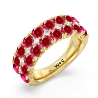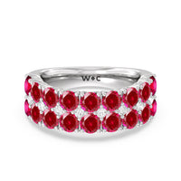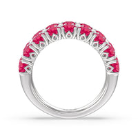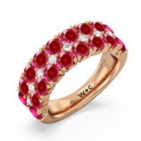An elegant and ethereal half-eternity ring to dazzle your soulmate. This anniversary band features double rows of brilliant round stones traced at the center by a slim line of evenly set petite created Rubys. Finished with a perfectly polished band, this ring guarantees to be a heartwarming and, at the same time, an attention-grabbing piece.