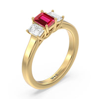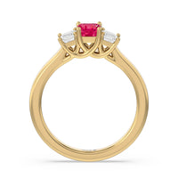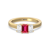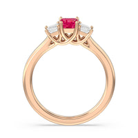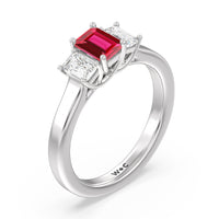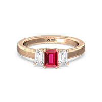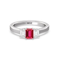 A striking style featuring a centerpiece created Ruby highlighted by two smaller matching diamonds either side.