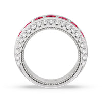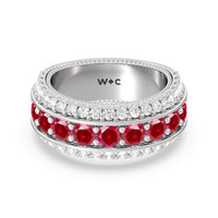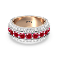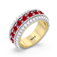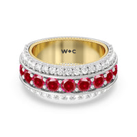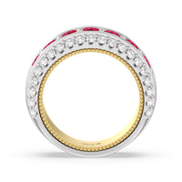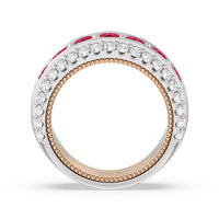 With triple rows of stones running halfway down the shank, expect this gorgeous two-toned ring to deliver an abundance of sparkle. This piece is designed with a wide band with round diamonds and created Ruby on shared prongs tracing its center. The edges are outlined with pave-set petite diamonds. The inner shank's surface is in yellow gold with milgrain outline for a bit of added drama.