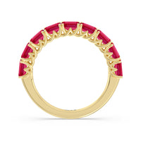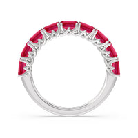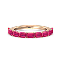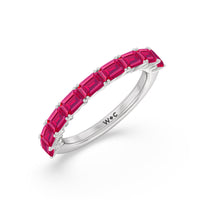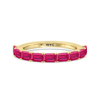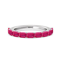 This ring looks modest and refined yet has a charming, unexpected twist. The slim band has its upper half traced with nine emerald-cut Created Rubys Each stone is secured by a four-prong U-shaped basket that intertwines with a wavy bridge.