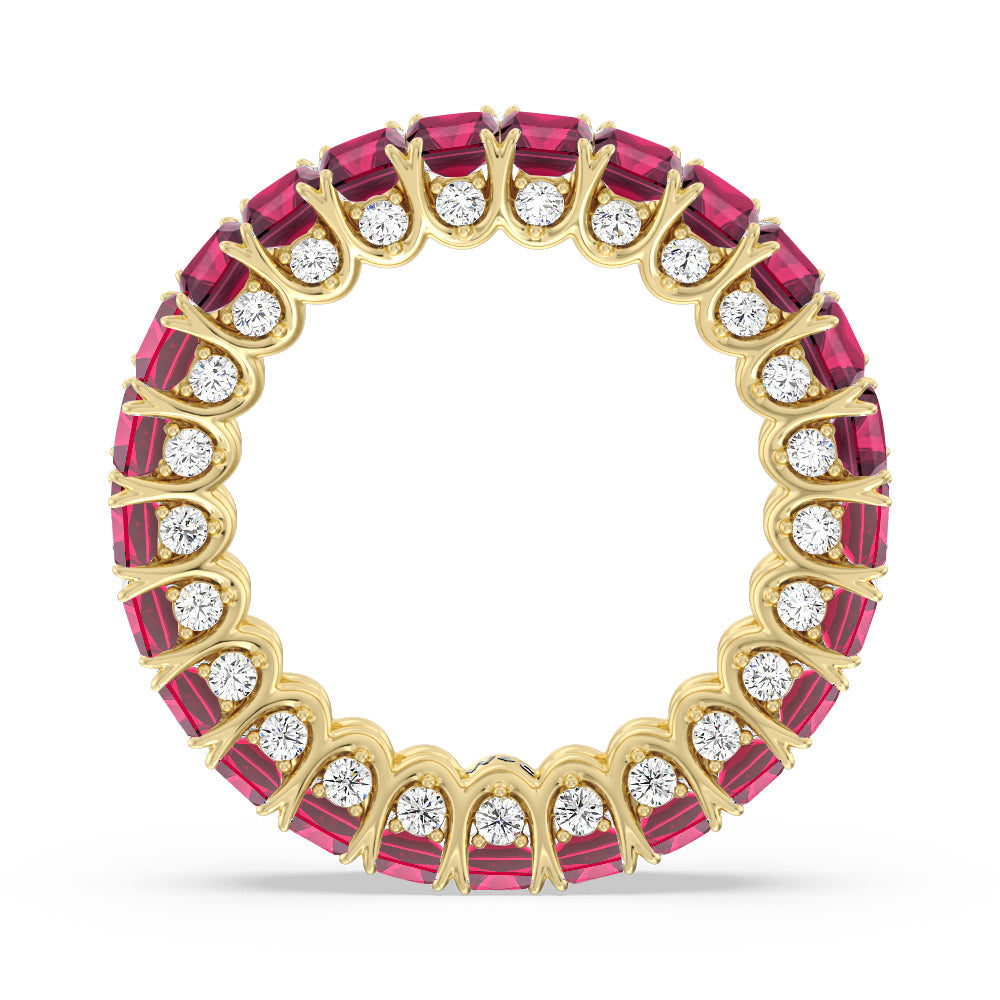 A ring of infinite sparkle. This eternity band in white gold features U-shaped split prong baskets securing brilliant Emerald created Ruby. A scalloped profile forms on the inside of the ring and delivers a unique look. More petite round diamonds punctuate each U-shaped curve of each prong for brilliance that shine at any angle.