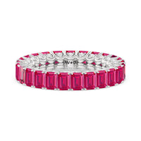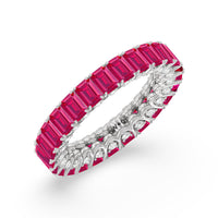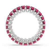 A ring of infinite sparkle. This eternity band in white gold features U-shaped split prong baskets securing brilliant Emerald created Ruby. A scalloped profile forms on the inside of the ring and delivers a unique look. More petite round diamonds punctuate each U-shaped curve of each prong for brilliance that shine at any angle.