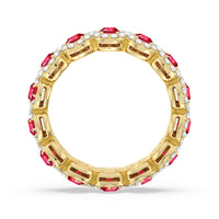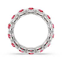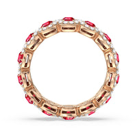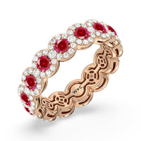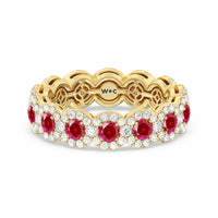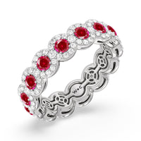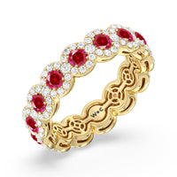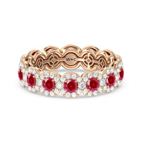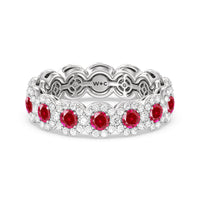 This diamond eternity ring has a look that's incredibly alluring. The band is made up of round diamonds and created Ruby encircled by no gap halos of even more diamonds. The striking and unforgettable sparkle of this ring is the perfect representation of love that glows and grows.