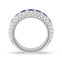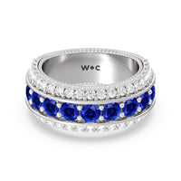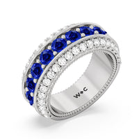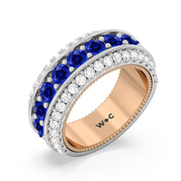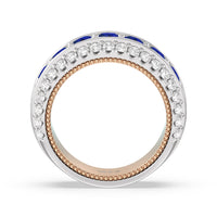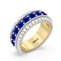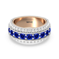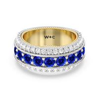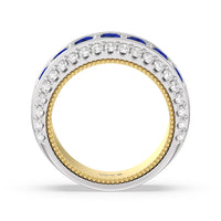 With triple rows of stones running halfway down the shank, expect this gorgeous two-toned ring to deliver an abundance of sparkle. This piece is designed with a wide band with round diamonds and created sapphire on shared prongs tracing its center. The edges are outlined with pave-set petite diamonds. The inner shank's surface is in yellow gold with milgrain outline for a bit of added drama.