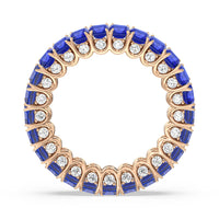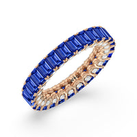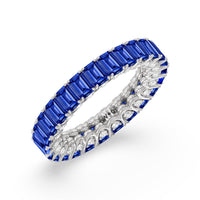A ring of infinite sparkle. This eternity band in white gold features U-shaped split prong baskets securing brilliant Emerald created sapphire. A scalloped profile forms on the inside of the ring and delivers a unique look. More petite round diamonds punctuate each U-shaped curve of each prong for brilliance that shine at any angle.