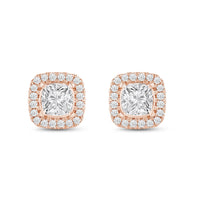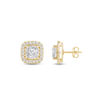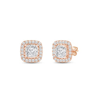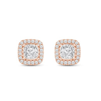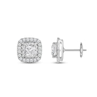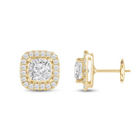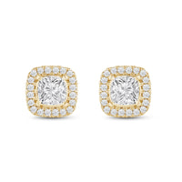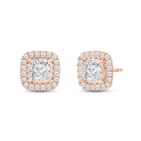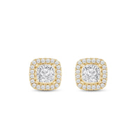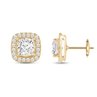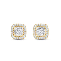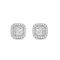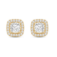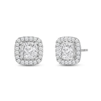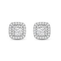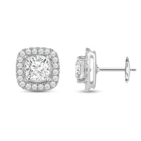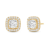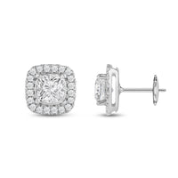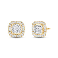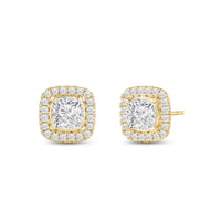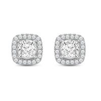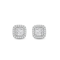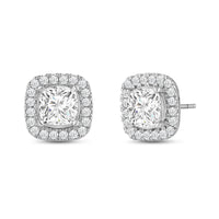 Classic cushion cut earrings with a stunning halo of round stones encircling the center stone.A lovely outfit-maker, this pair of stud earrings is what you need to give any ensemble a polished, put-together finish.