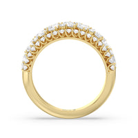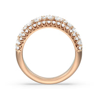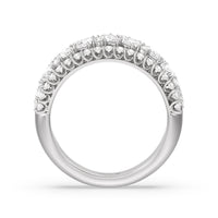 Your non-conforming special someone will surely be captivated by the brilliance of this ring. It features a tapering band with a wide top bordered by a row of round stones on its edges. At the center is a band of pear-shaped and round stones in a "dancing" pattern. Giving this studded anniversary ring to celebrate a milestone in your relationship will surely leave a lasting mark.