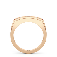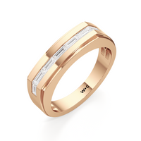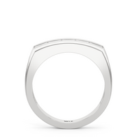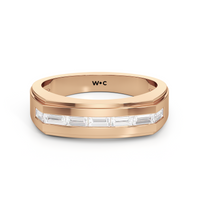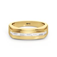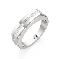 A fusion of strength and style—this men’s diamond ring boasts a sleek band with a flat top, detailed with a channel of baguette diamonds in between slightly raised borders. The ring impresses with its architectural design with bold facets and luminous diamonds.