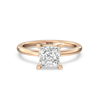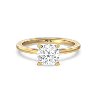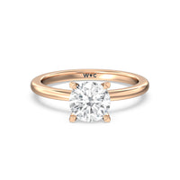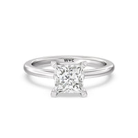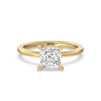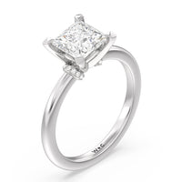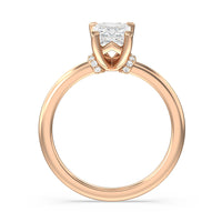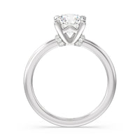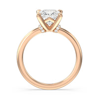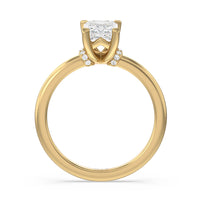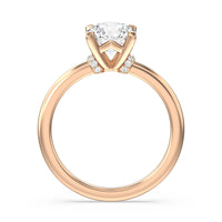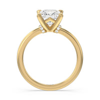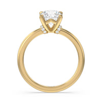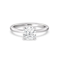 This modern slim line band is finished off with a diamond collar detail to highlight the center stone along with our signature claw setting.