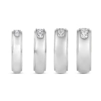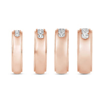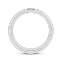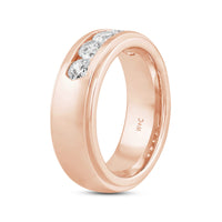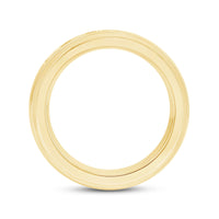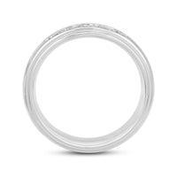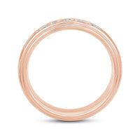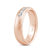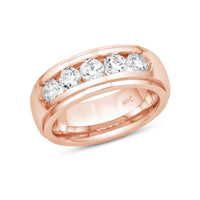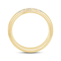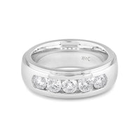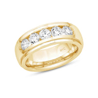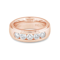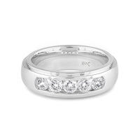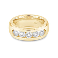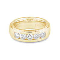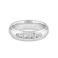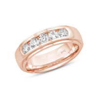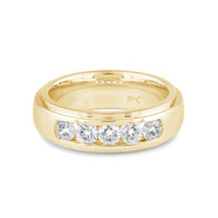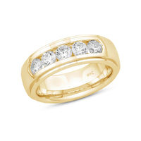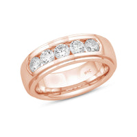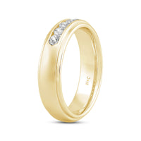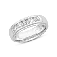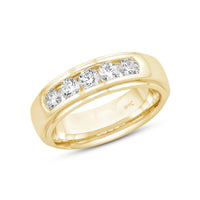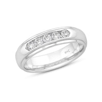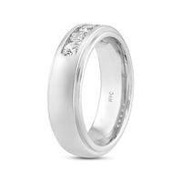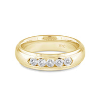 A dashing ring for a debonair gentleman. This band beautifully reflects your man's sophisticated style. The polished ring features a domed profile with a flat edge. It is punctuated by five diamonds on a secure channel setting for an extra brilliant shine.
