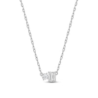 The beauty of restraint is clearly evident in this necklace. It features a slender necklace chain holding a two-stone pendant composed of a round and emerald-cut diamond. Those who love luxury but appreciate subtlety will be instantly drawn to this two-stone diamond necklace's easy elegance.