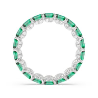 This eternity ring showcases a stunning balance between vintage glamour and feminine romance. It features emerald-cut created Emerald in an east-west setting evoking Art Deco's architectural splendor. Each emerald-cut diamond is set on a thick U-shaped prong punctuated by a pair of petite round diamonds on its side. The curved yellow gold prongs form a circle and makeup the graceful, scalloped base of the band.