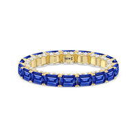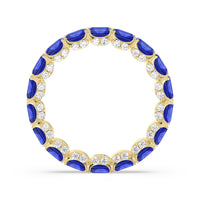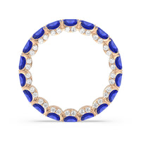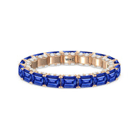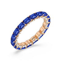 This eternity ring showcases a stunning balance between vintage glamour and feminine romance. It features emerald-cut created sapphire in an east-west setting evoking Art Deco's architectural splendor. Each emerald-cut diamond is set on a thick U-shaped prong punctuated by a pair of petite round diamonds on its side. The curved yellow gold prongs form a circle and makeup the graceful, scalloped base of the band.