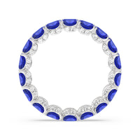 This eternity ring showcases a stunning balance between vintage glamour and feminine romance. It features emerald-cut created sapphire in an east-west setting evoking Art Deco's architectural splendor. Each emerald-cut diamond is set on a thick U-shaped prong punctuated by a pair of petite round diamonds on its side. The curved yellow gold prongs form a circle and makeup the graceful, scalloped base of the band.