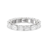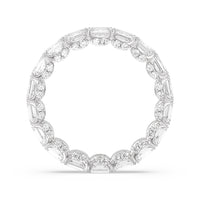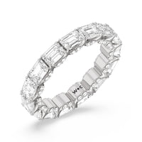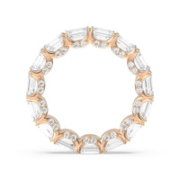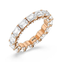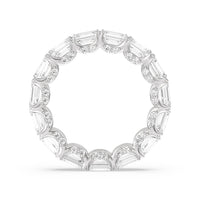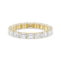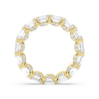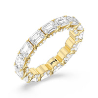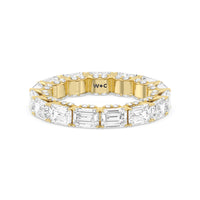 This eternity ring showcases a stunning balance between vintage glamour and feminine romance. It features emerald-cut diamonds in an east-west setting evoking Art Deco's architectural splendor. Each emerald-cut diamond is set on a thick U-shaped prong punctuated by a pair of petite round diamonds on its side. The curved yellow gold prongs form a circle and makeup the graceful, scalloped base of the band.