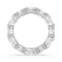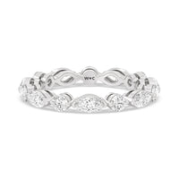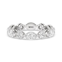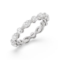 This diamond eternity ring visually displays the coming together of two individuals. The sculpted band features alternating marquise and round diamonds held securely by shared prongs. Tell your love story and your promise of lifelong commitment through this brilliant piece.