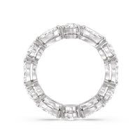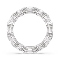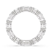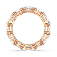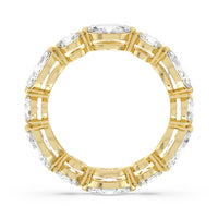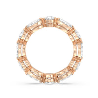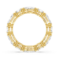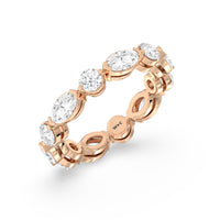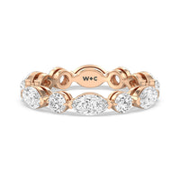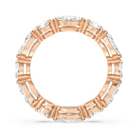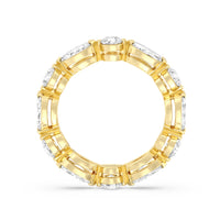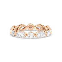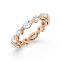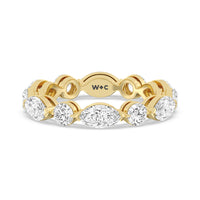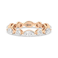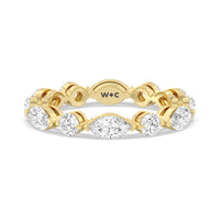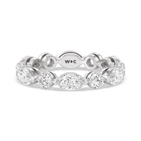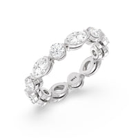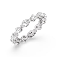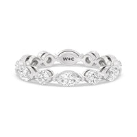 This diamond eternity ring visually displays the coming together of two individuals. The sculpted band features alternating marquise and round diamonds held securely by shared prongs. Tell your love story and your promise of lifelong commitment through this brilliant piece.