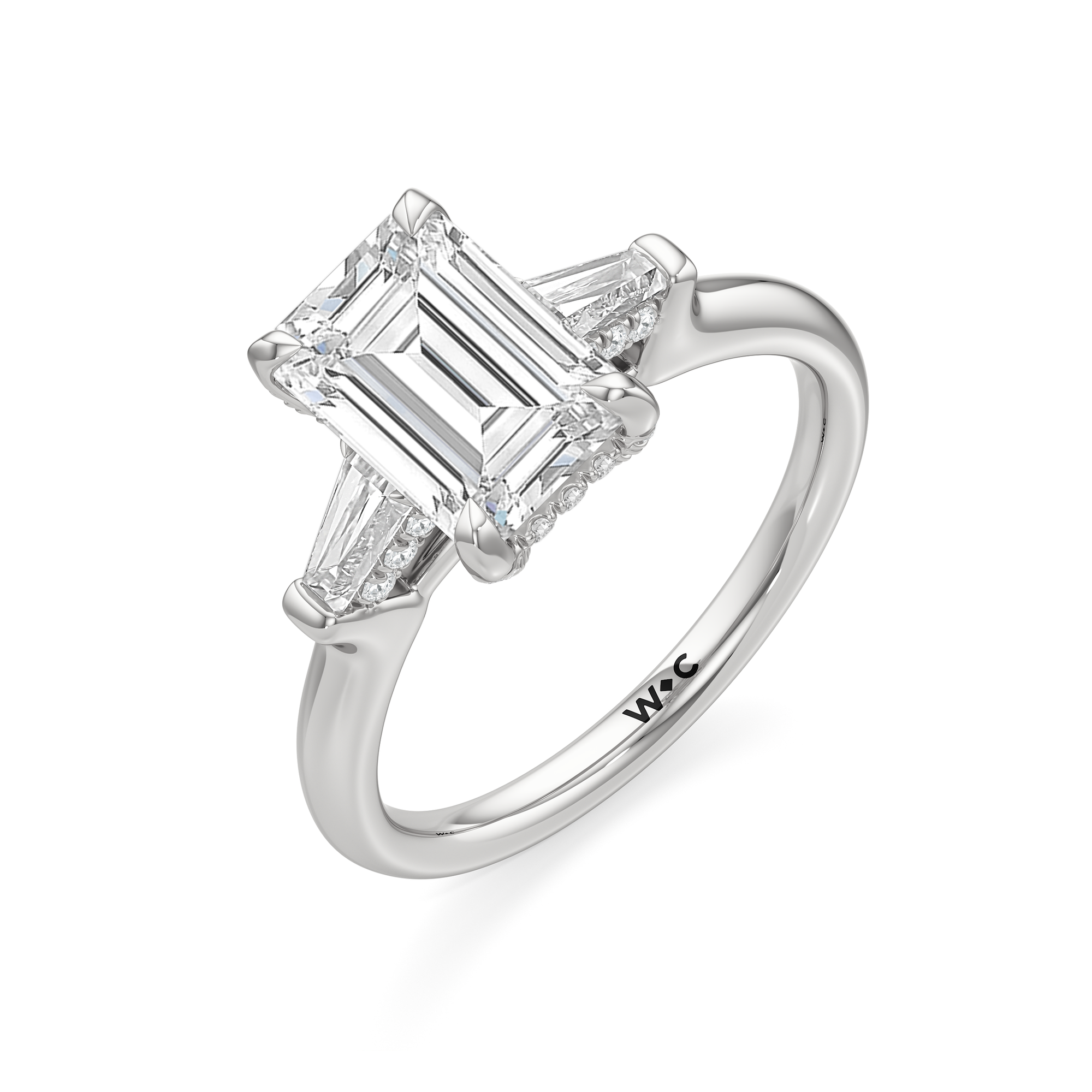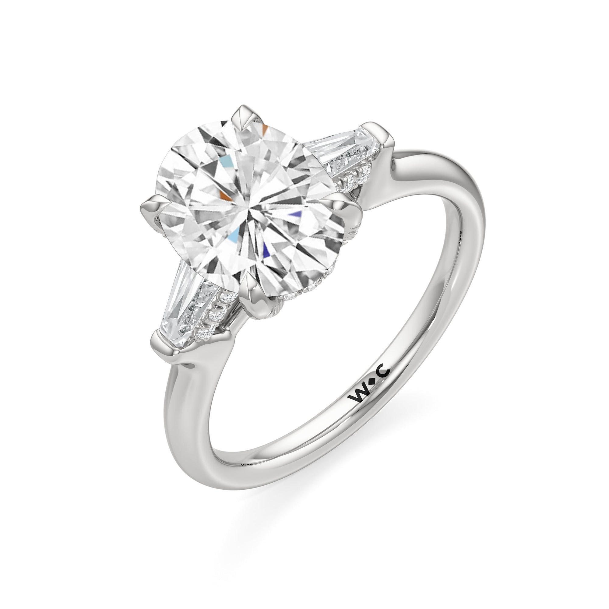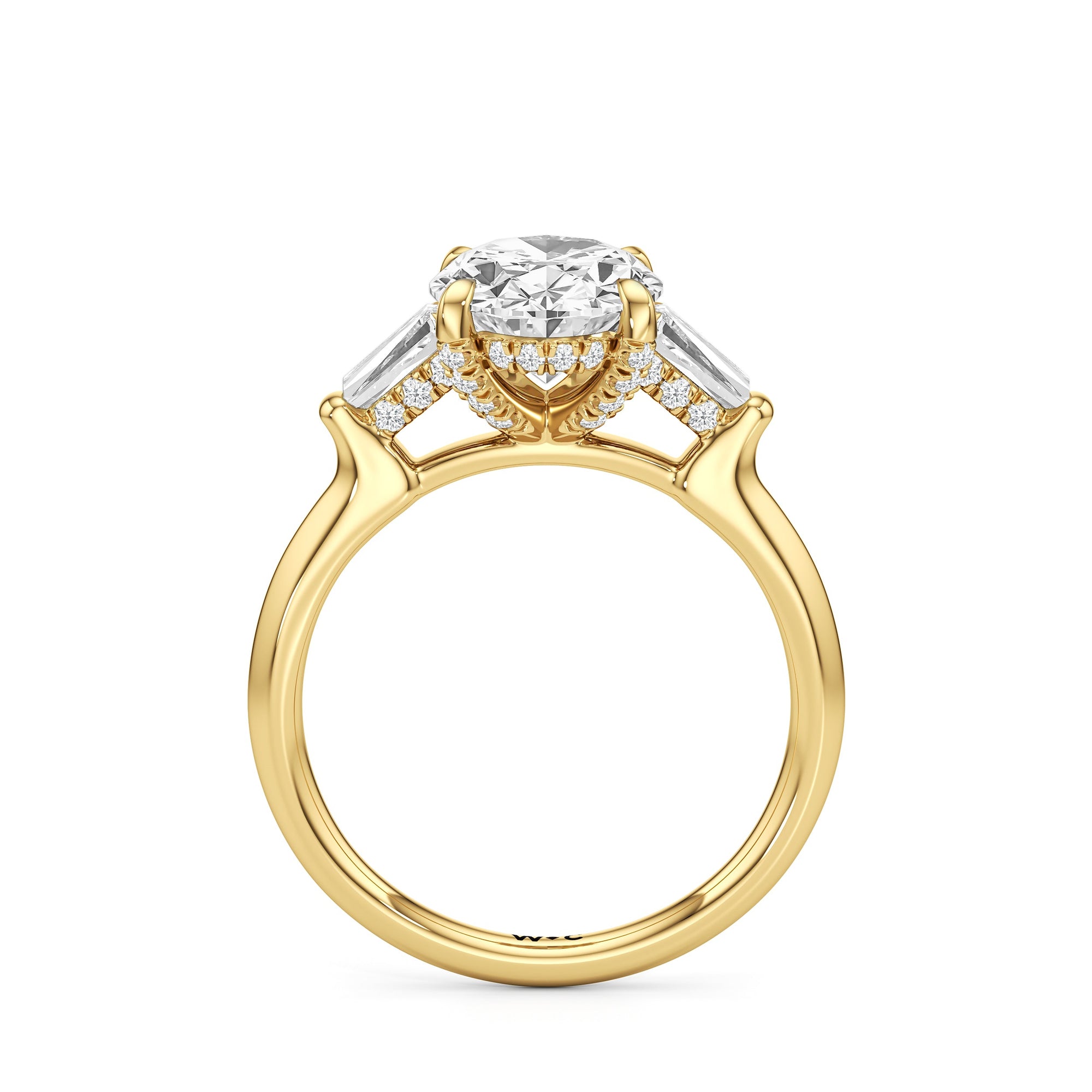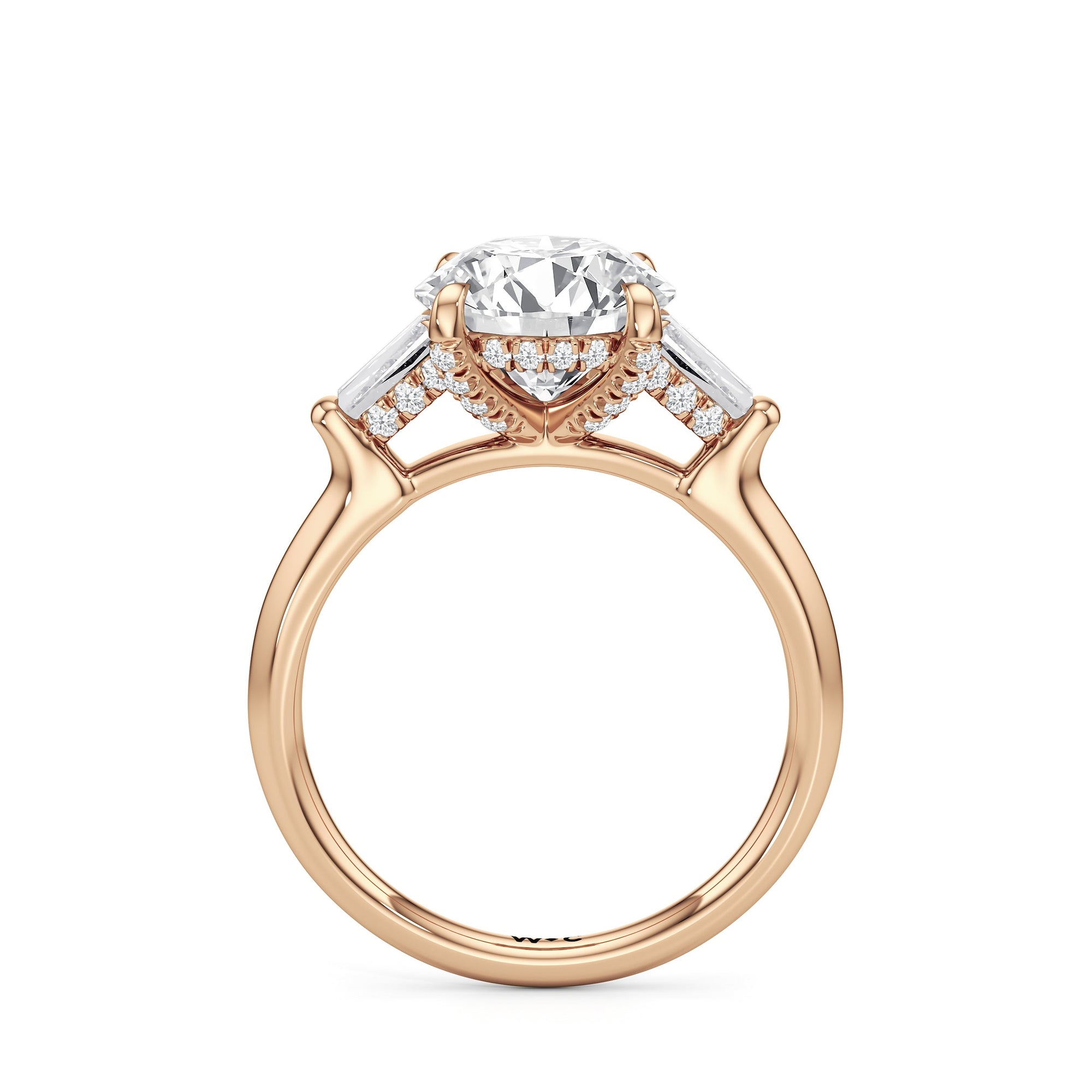 This ring embodies timeless sophistication, sculptural trillion-cut side stones that enhance its brilliance. The sleek, polished band and refined setting create a seamless flow of light and symmetry, offering a modern yet enduring expression of elegance.
