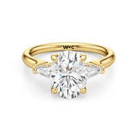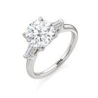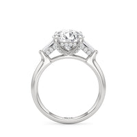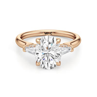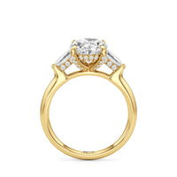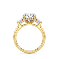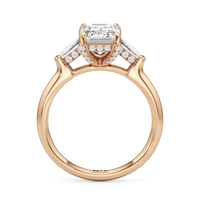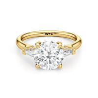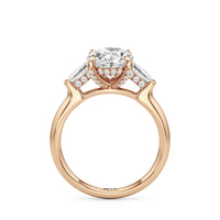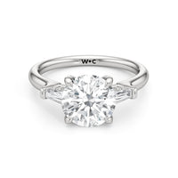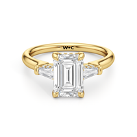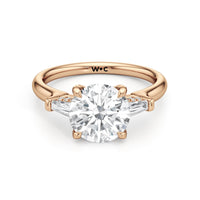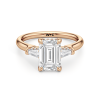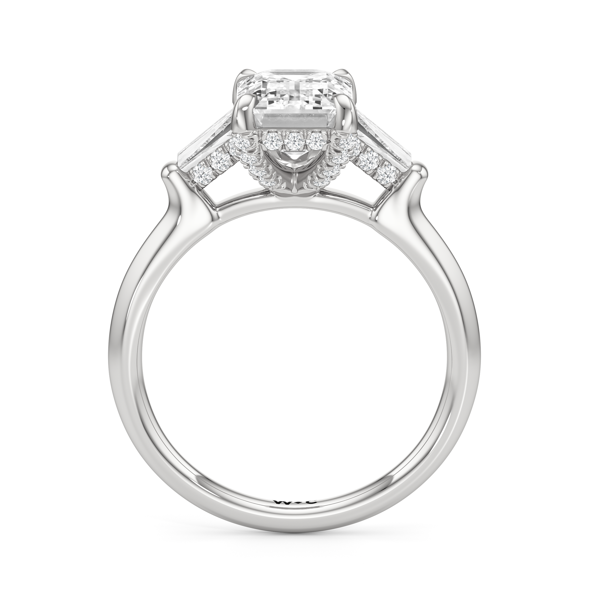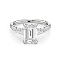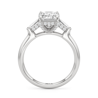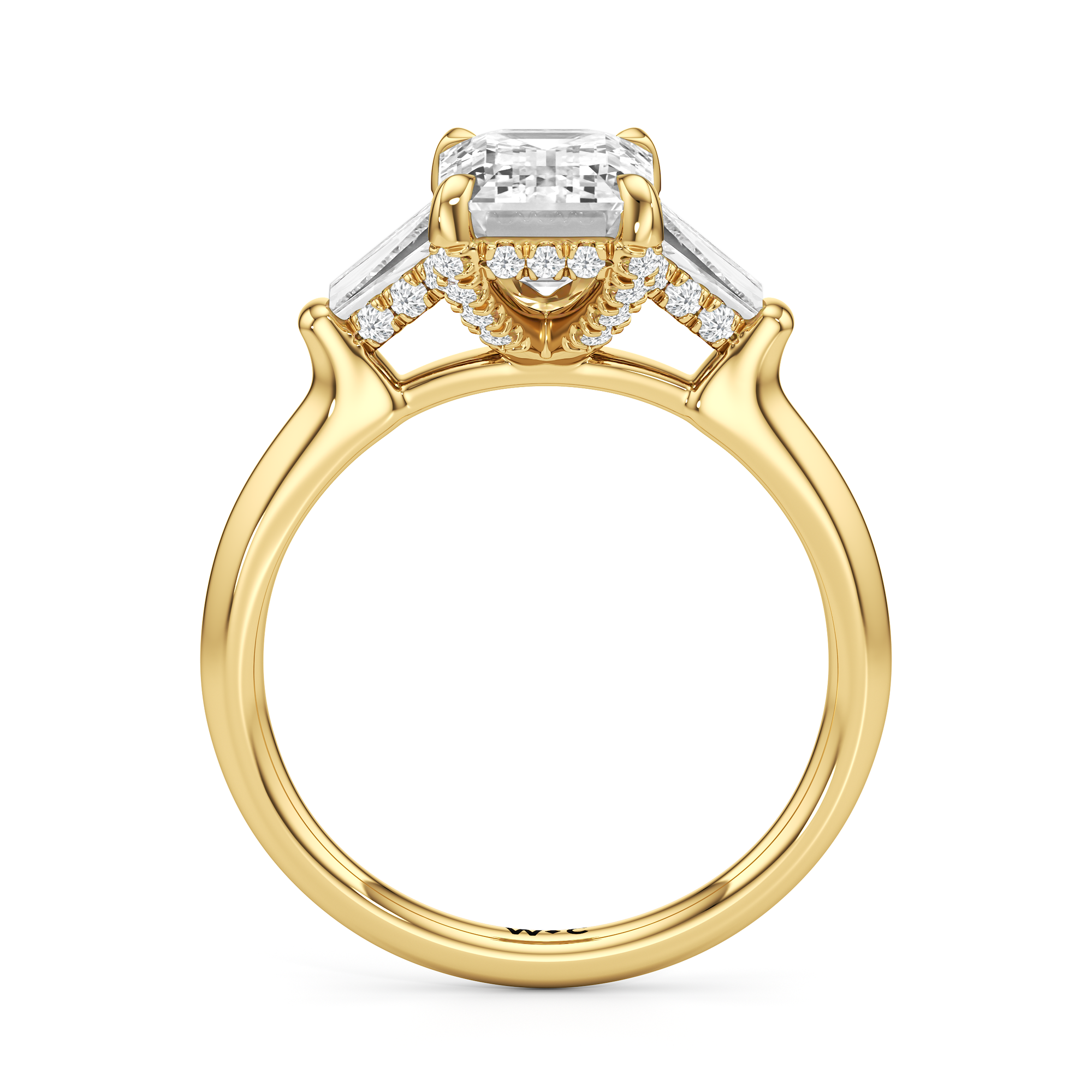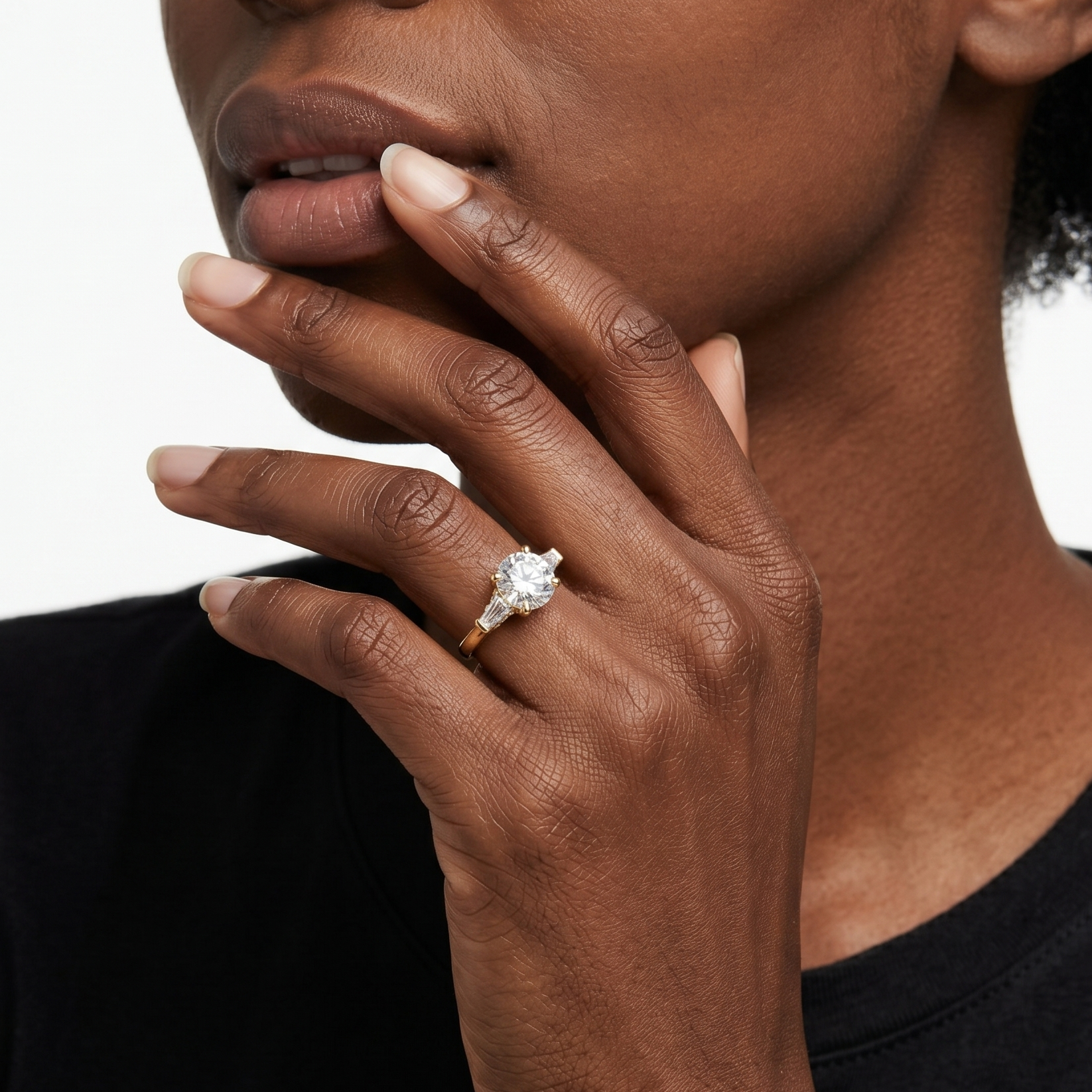 This ring embodies timeless sophistication, sculptural trillion-cut side stones that enhance its brilliance. The sleek, polished band and refined setting create a seamless flow of light and symmetry, offering a modern yet enduring expression of elegance.