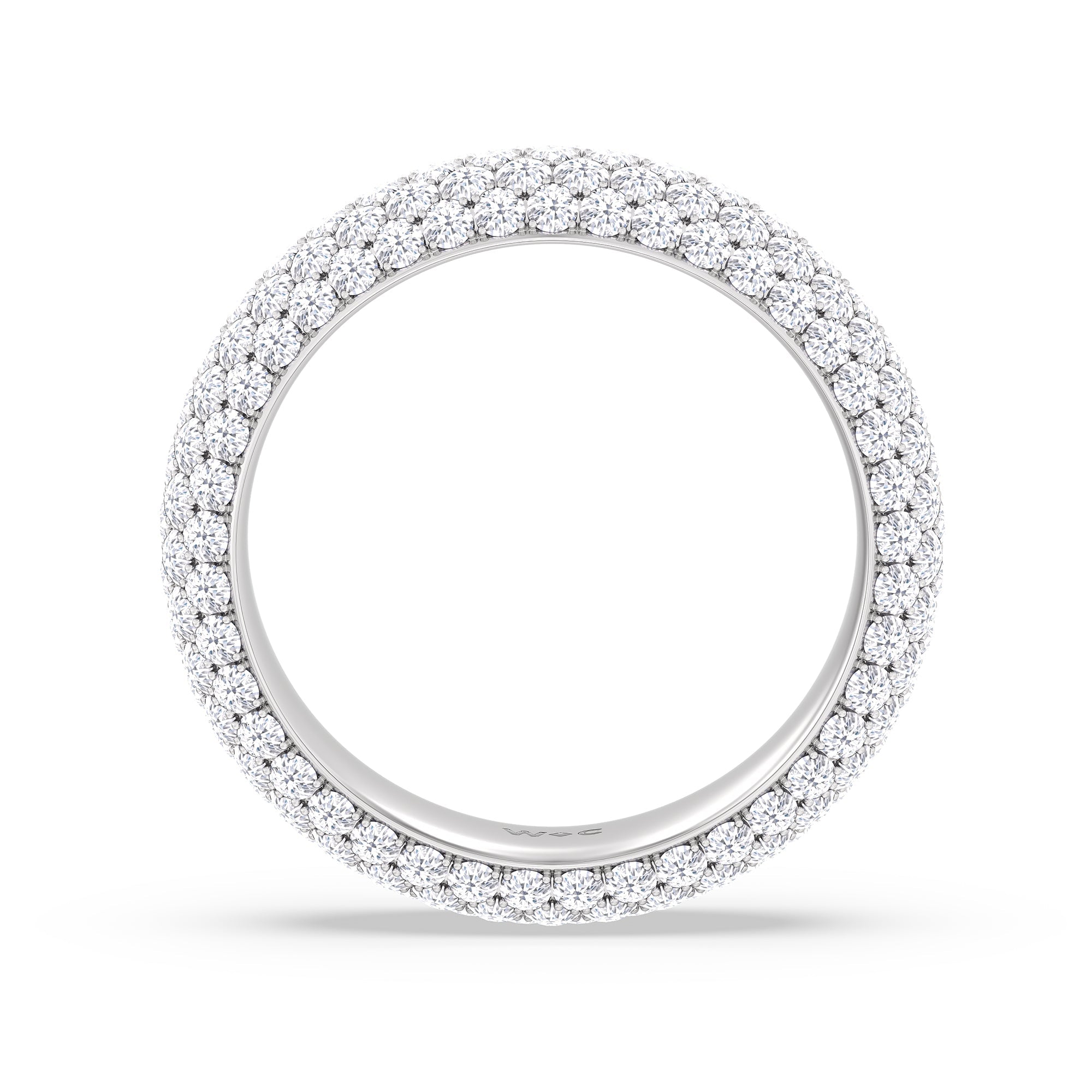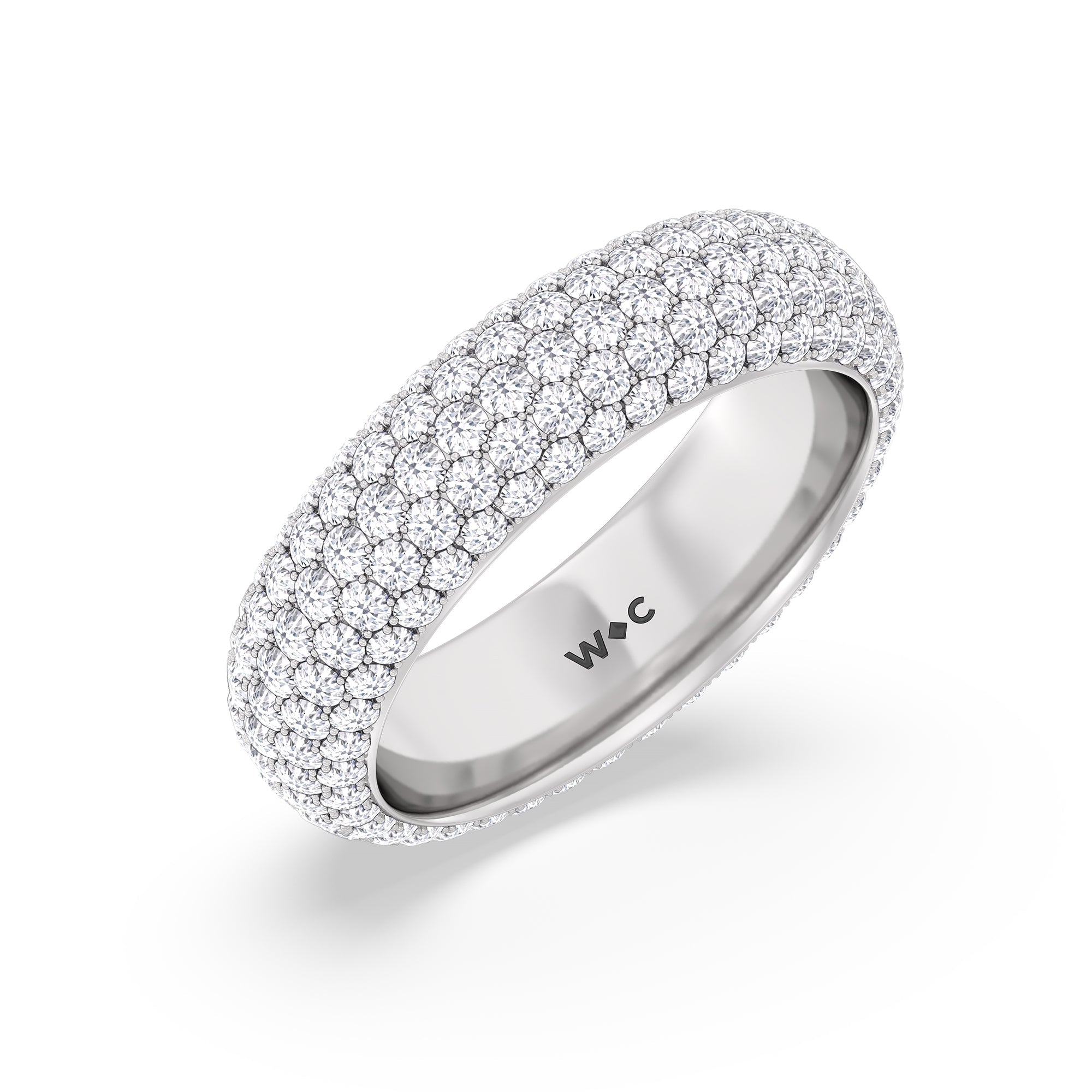 Crafted with five rows of pavé-set diamonds, this eternity band is undeniably a showstopper. The masterfully crafted band commands attention with its full circle of diamonds, showcasing an extraordinary play of light.